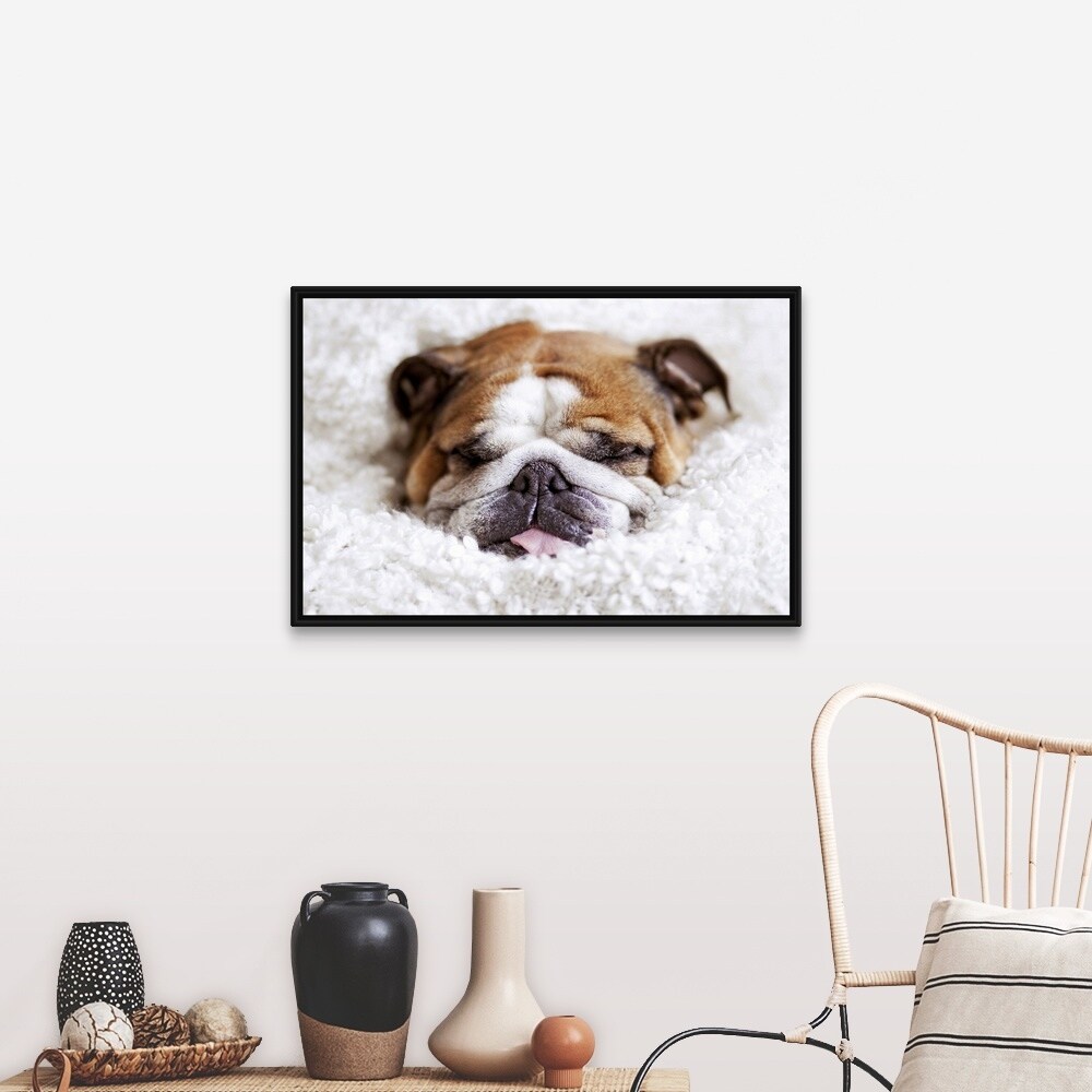"English bulldog sleeping in cute and funny position, wrapped in white blanket." Black Float Frame Canvas Art
