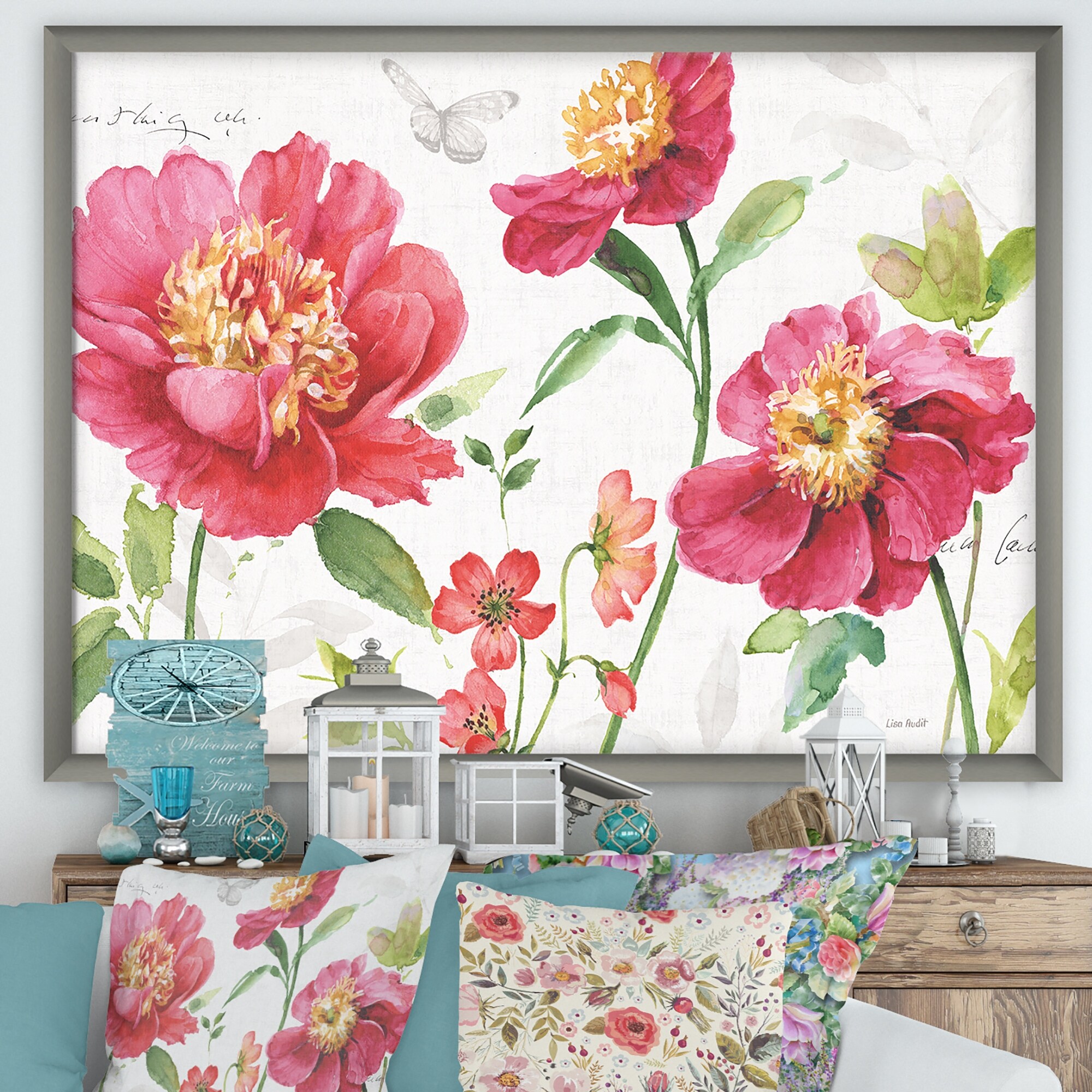 Designart "Red Springflowers and Butterfly" Cabin & Lodge Framed Art Print