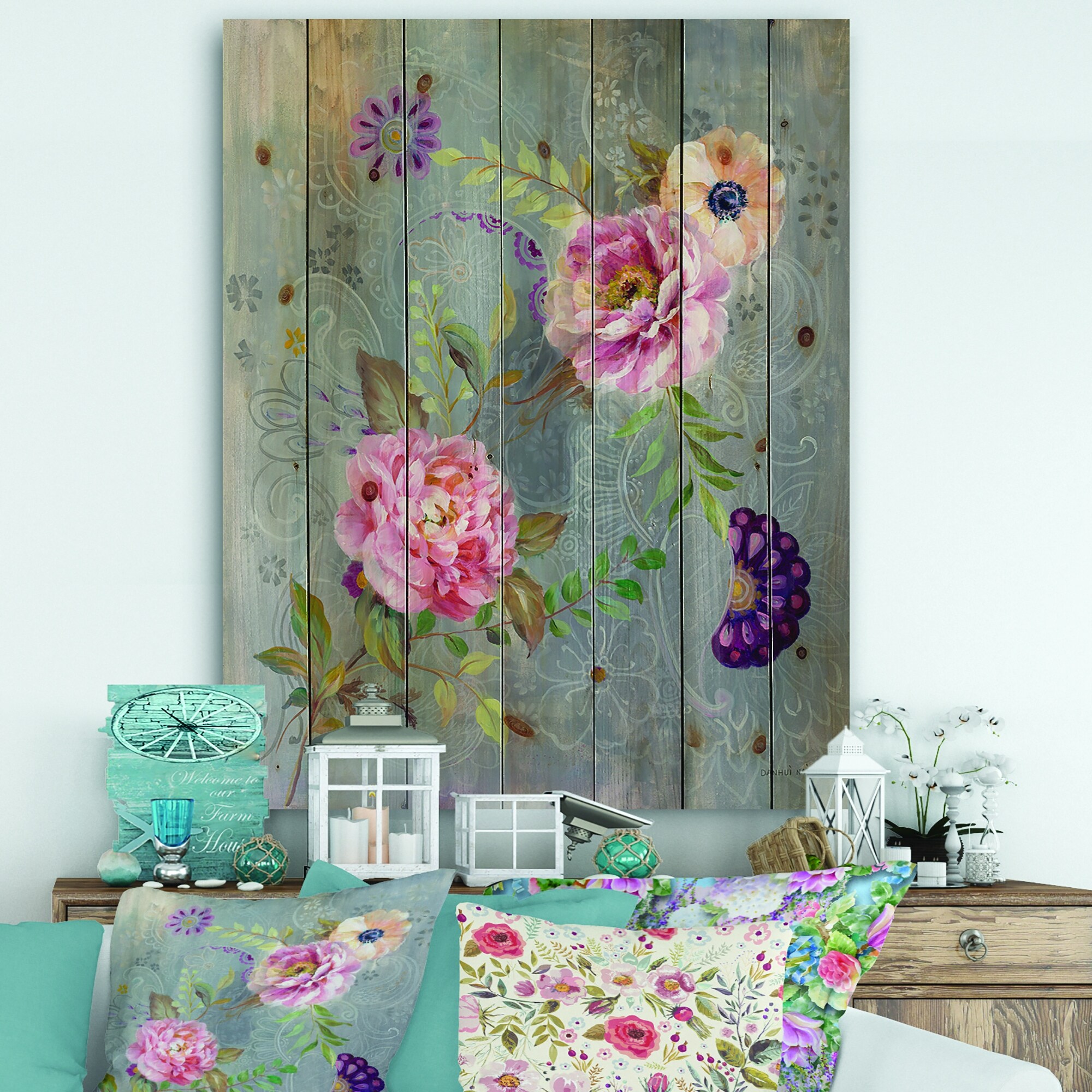 Designart 'Peonies and Paisley' Cabin & Lodge Print on Natural Pine Wood - Grey