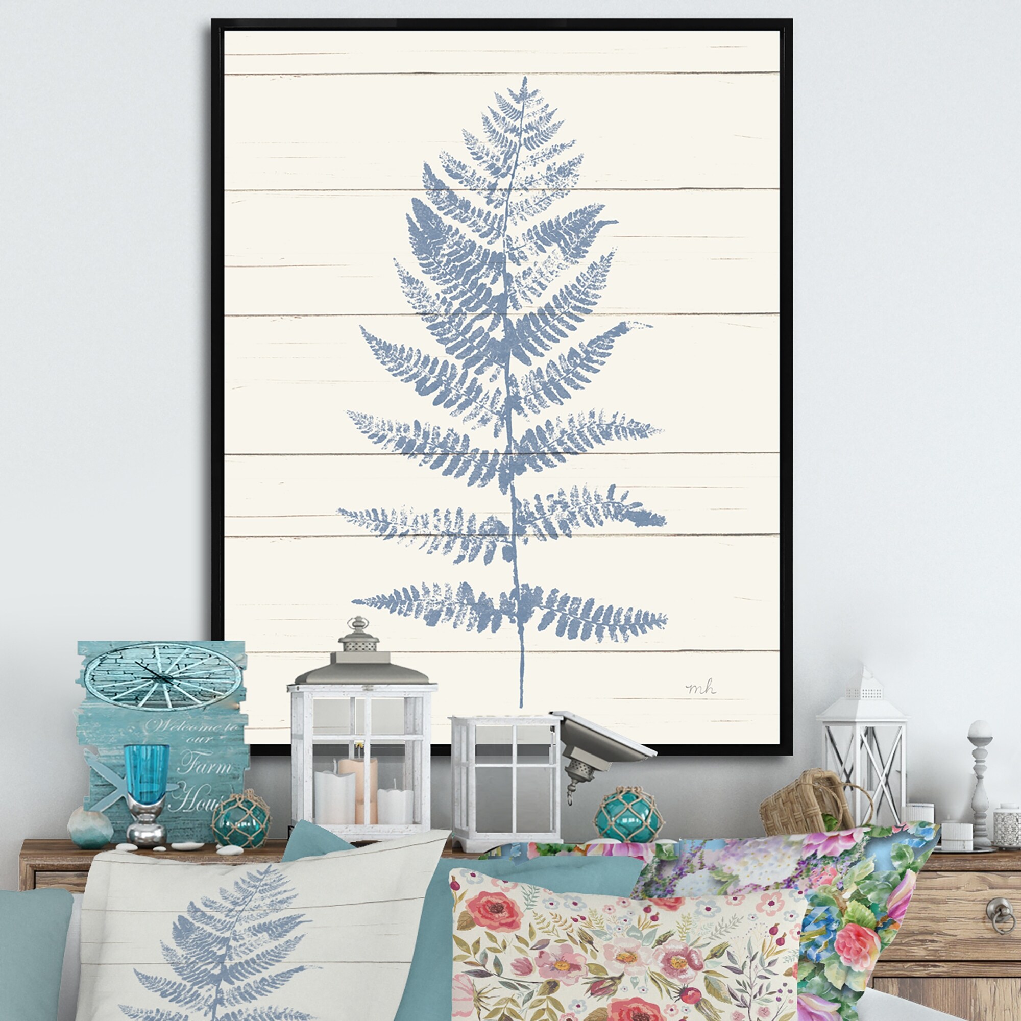Designart "Blue Fern Print on wood II" cabin & Lodge Framed Canvas - Blue