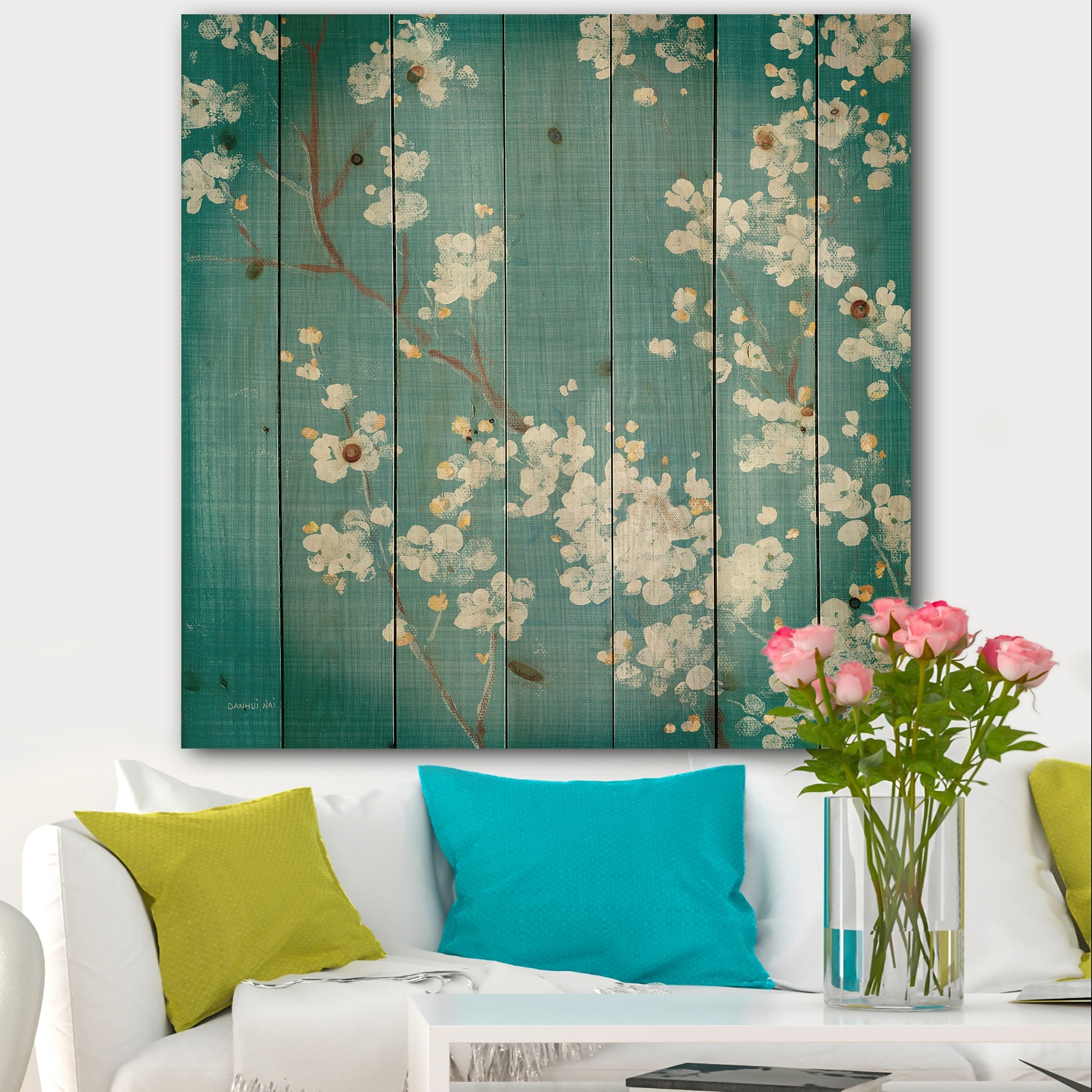 Designart 'Blue Cherry Blossoms I' Cabin & Lodge Print on Natural Pine Wood - Blue