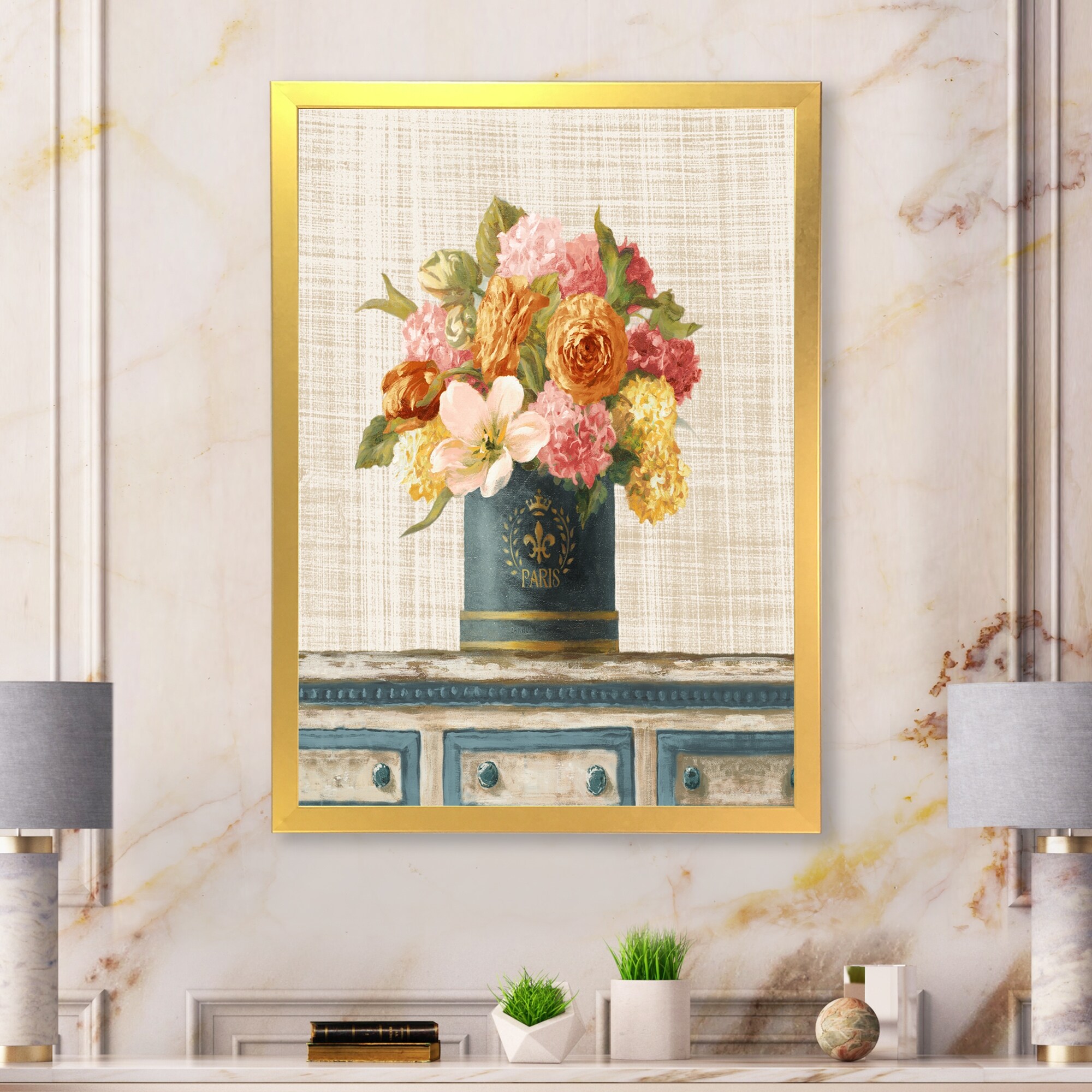 Designart "Tulips in Teal and Gold Hatbox on Linen" Cabin & Lodge Framed Art Print