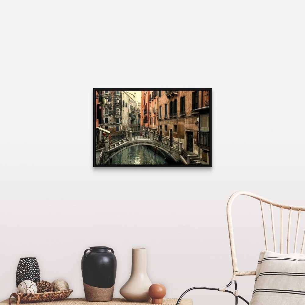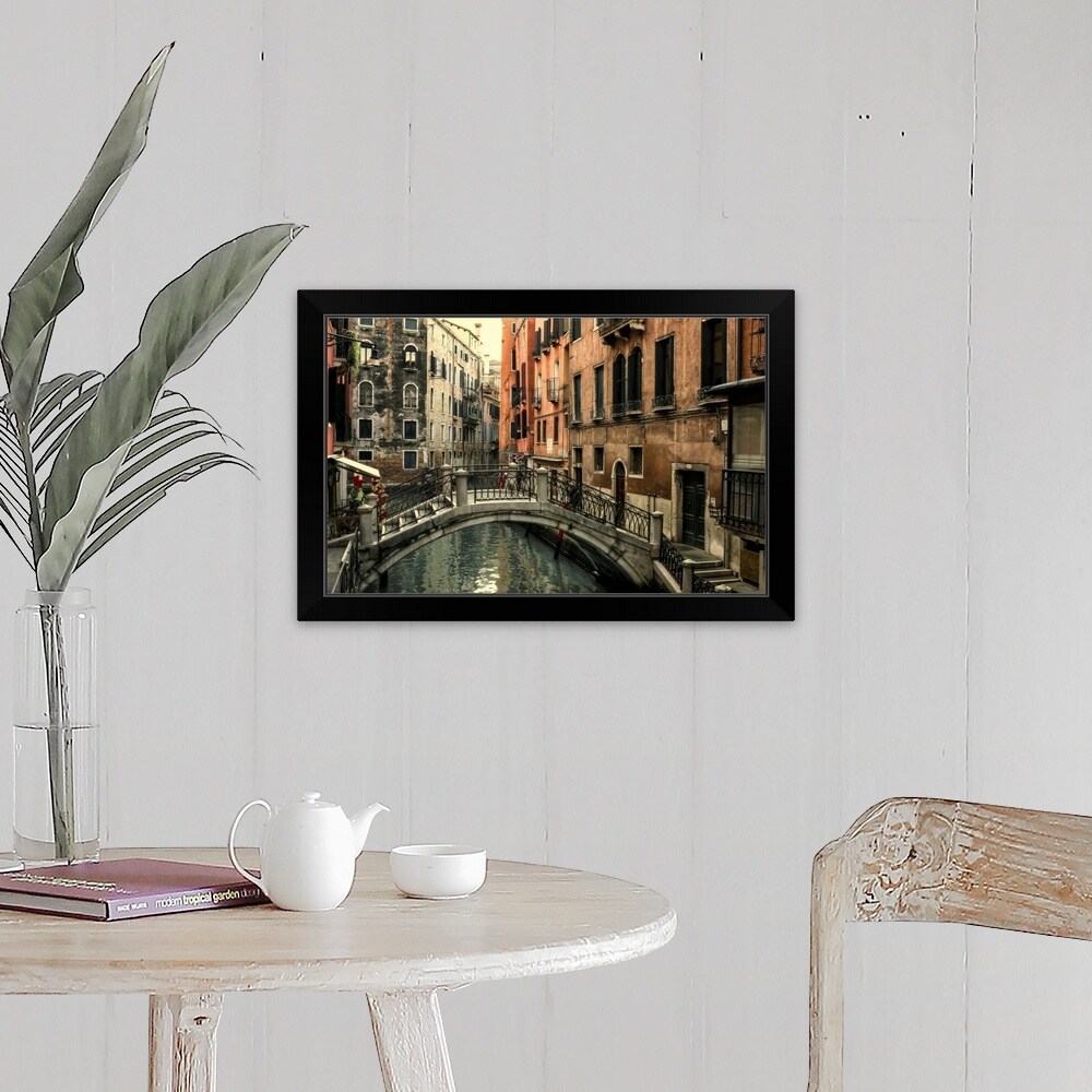 "Walking Bridge Over Venician Canal" Black Float Frame Canvas Art