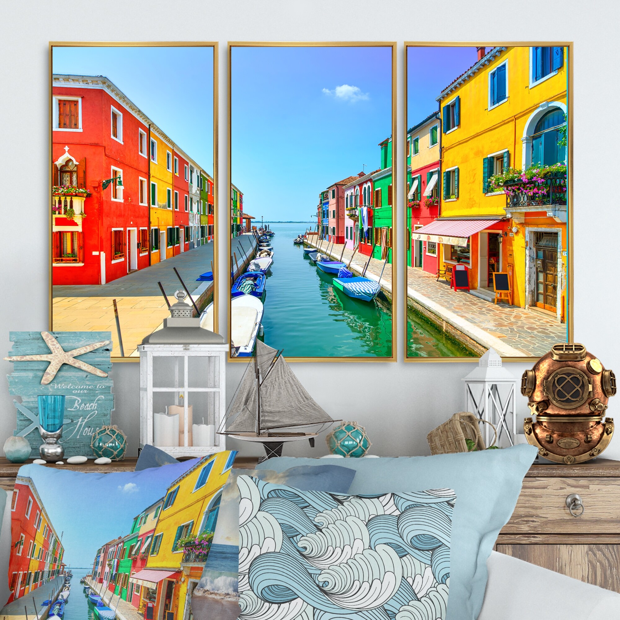 Designart "Colorful Burano Island Canal Venice" Landscape Framed Art Prints Set of 3 - 4 Colors of Frames