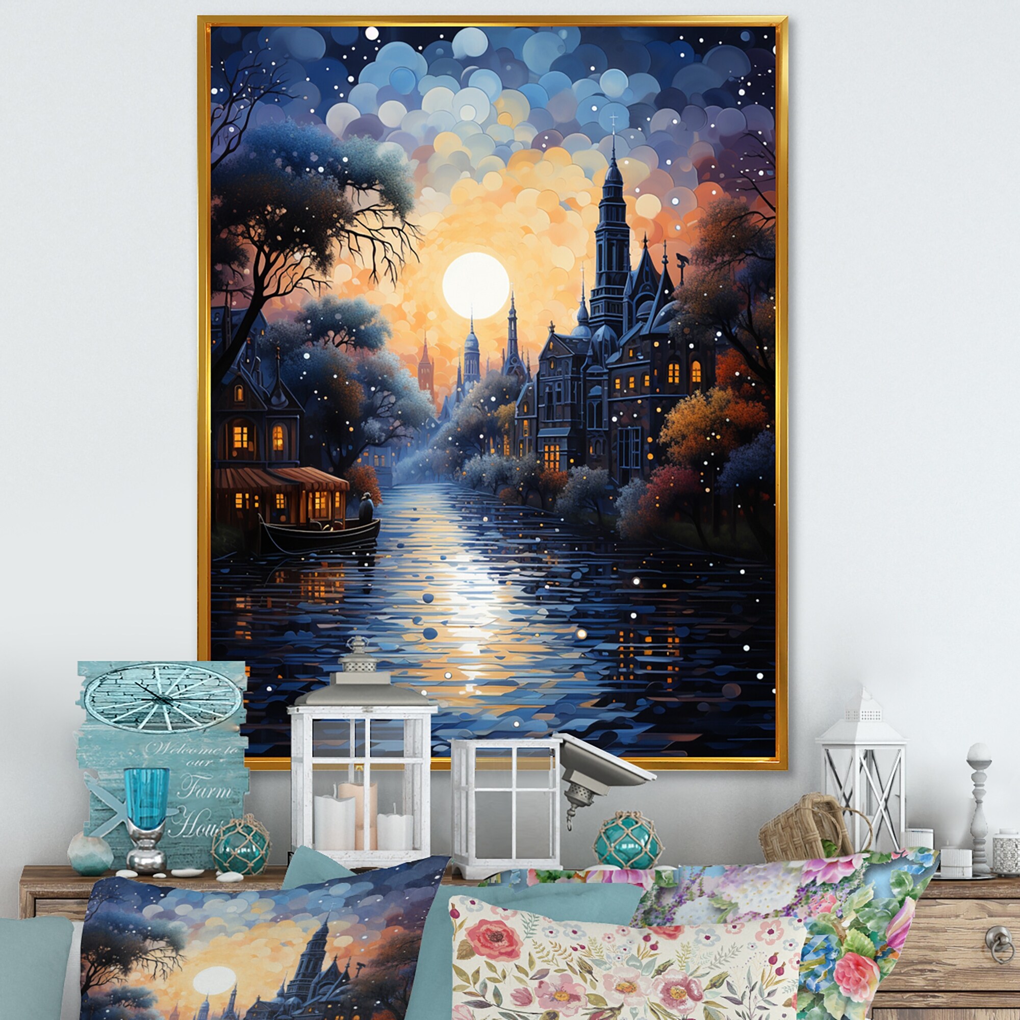 Designart "Yellow Canal Whimsy Pointillism" Canals Framed Canvas Prints