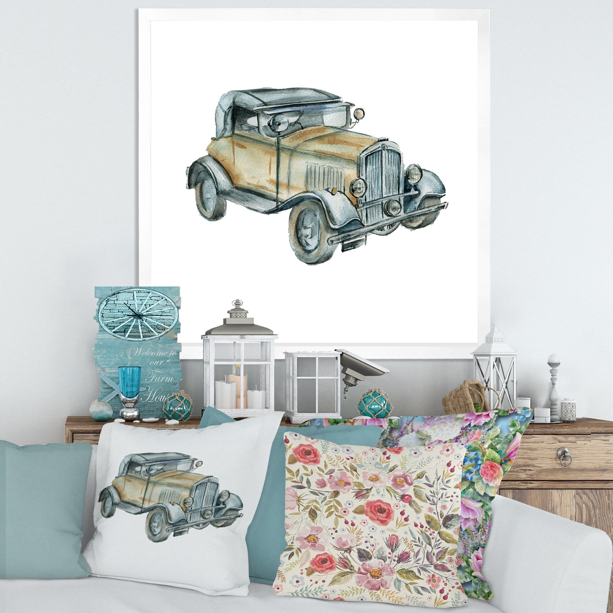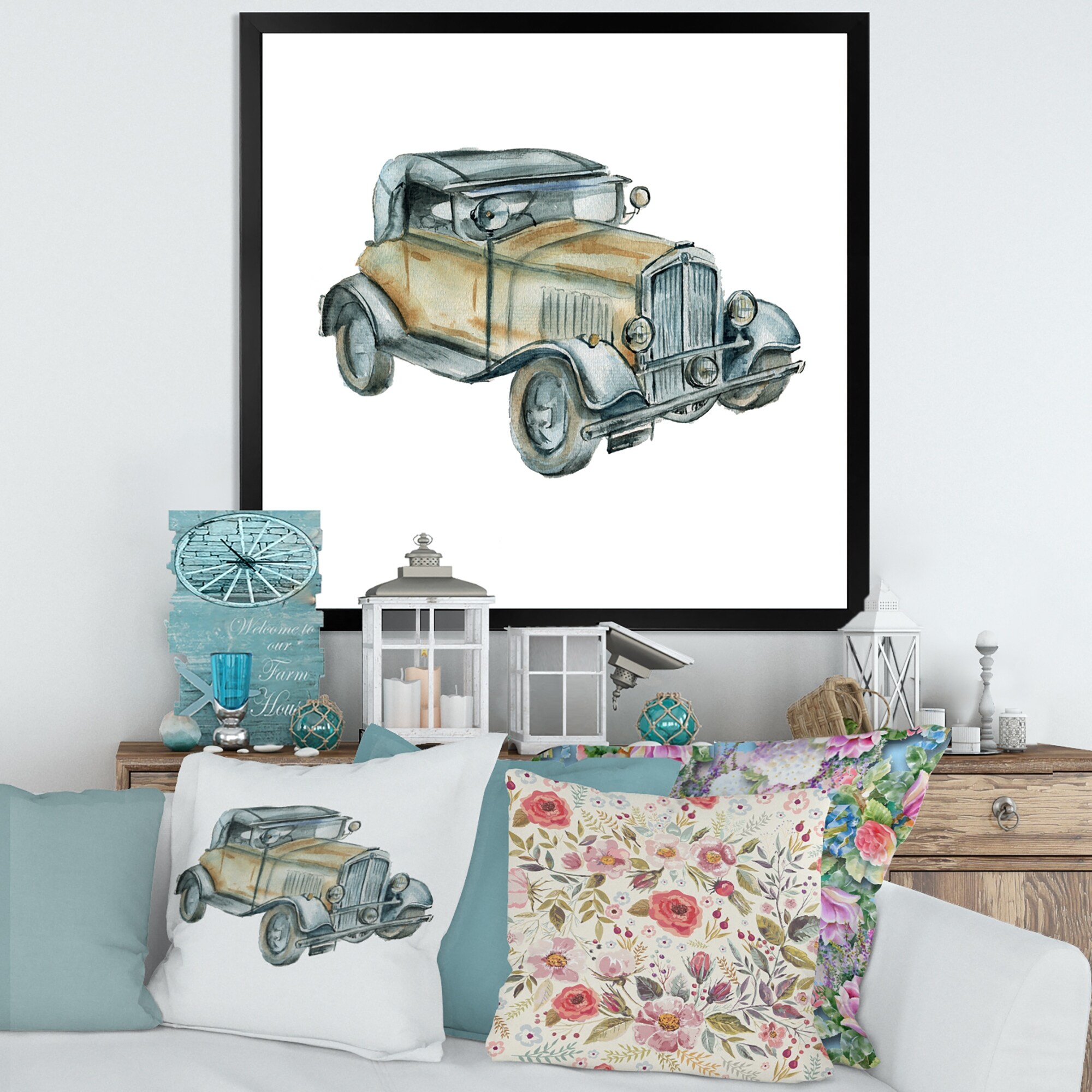 Designart "Blue And Yellow Retro Car Treasures" Retro Car Framed Wall Art for Living Room