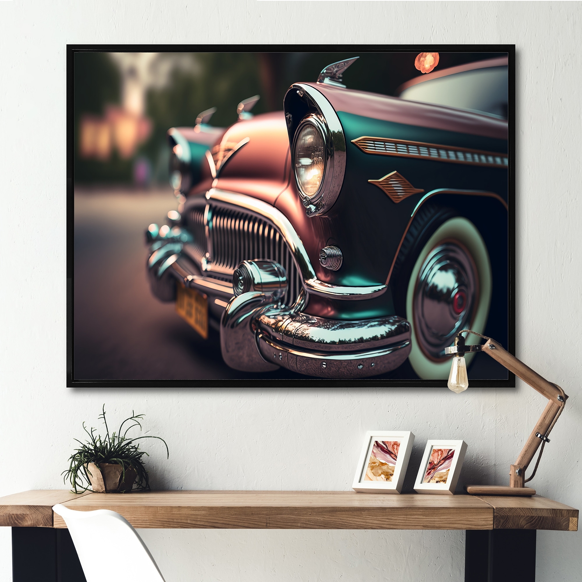 Designart "Green And Orange Reflections of Retro Cars" Retro Car Framed Canvas Art Print