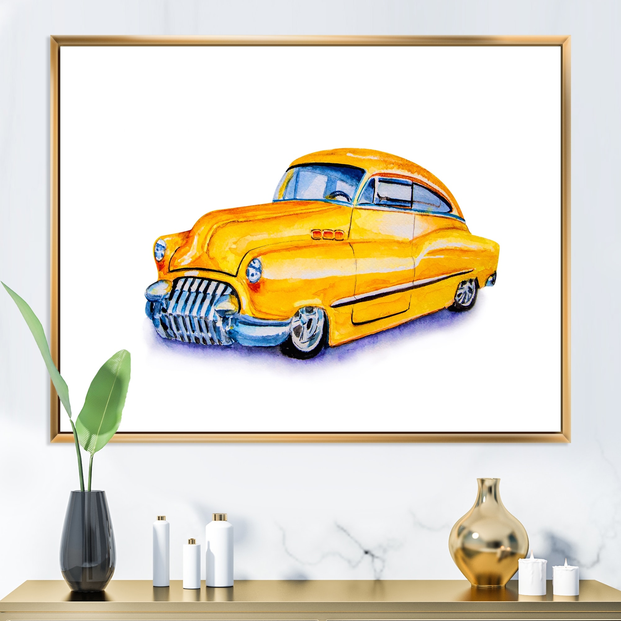 Designart "Yellow Retro Car" Industrial Framed Canvas Wall Art Print