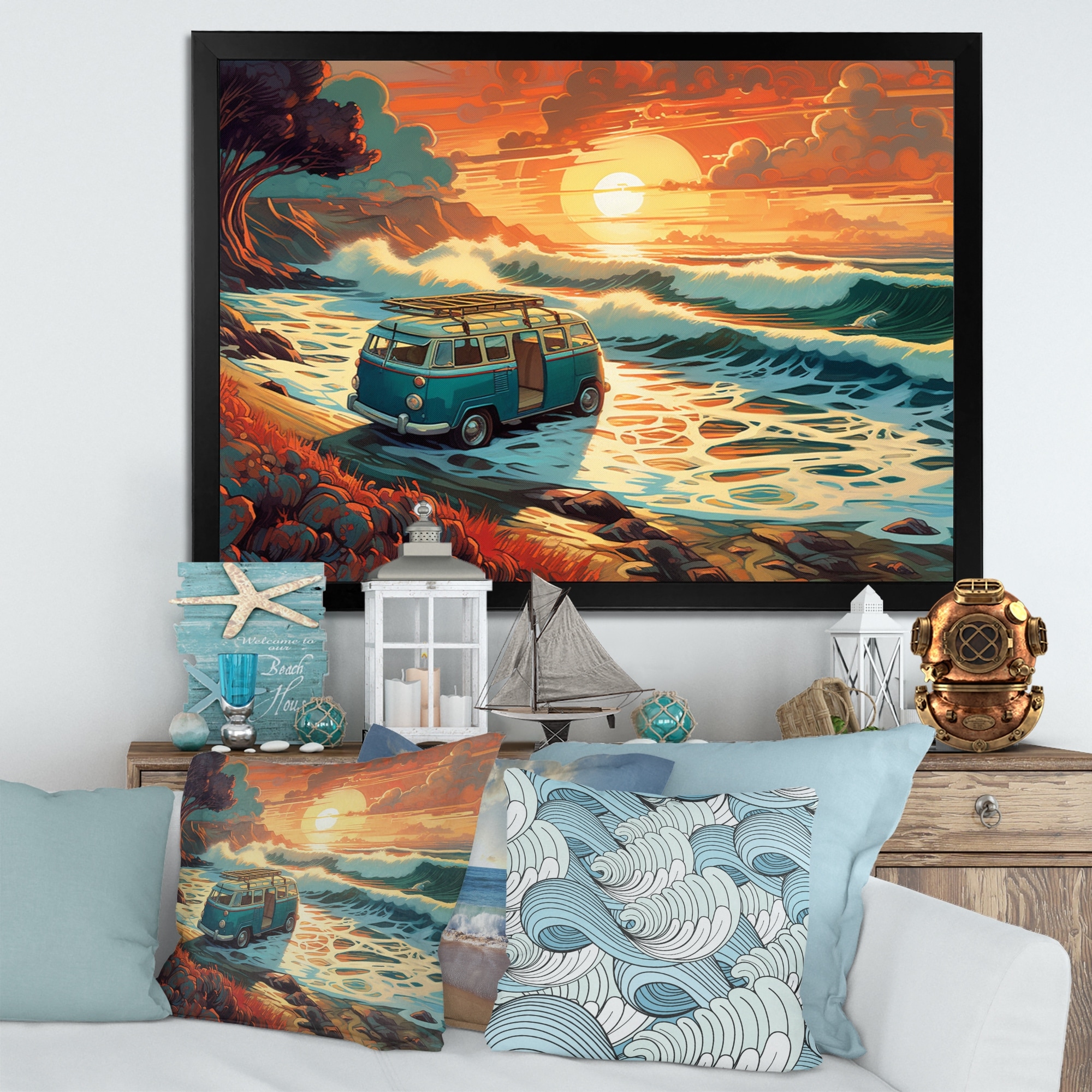 Designart "Green And Orange Retro Van on the Coastline Ii" Retro Car Framed Canvas Art Print