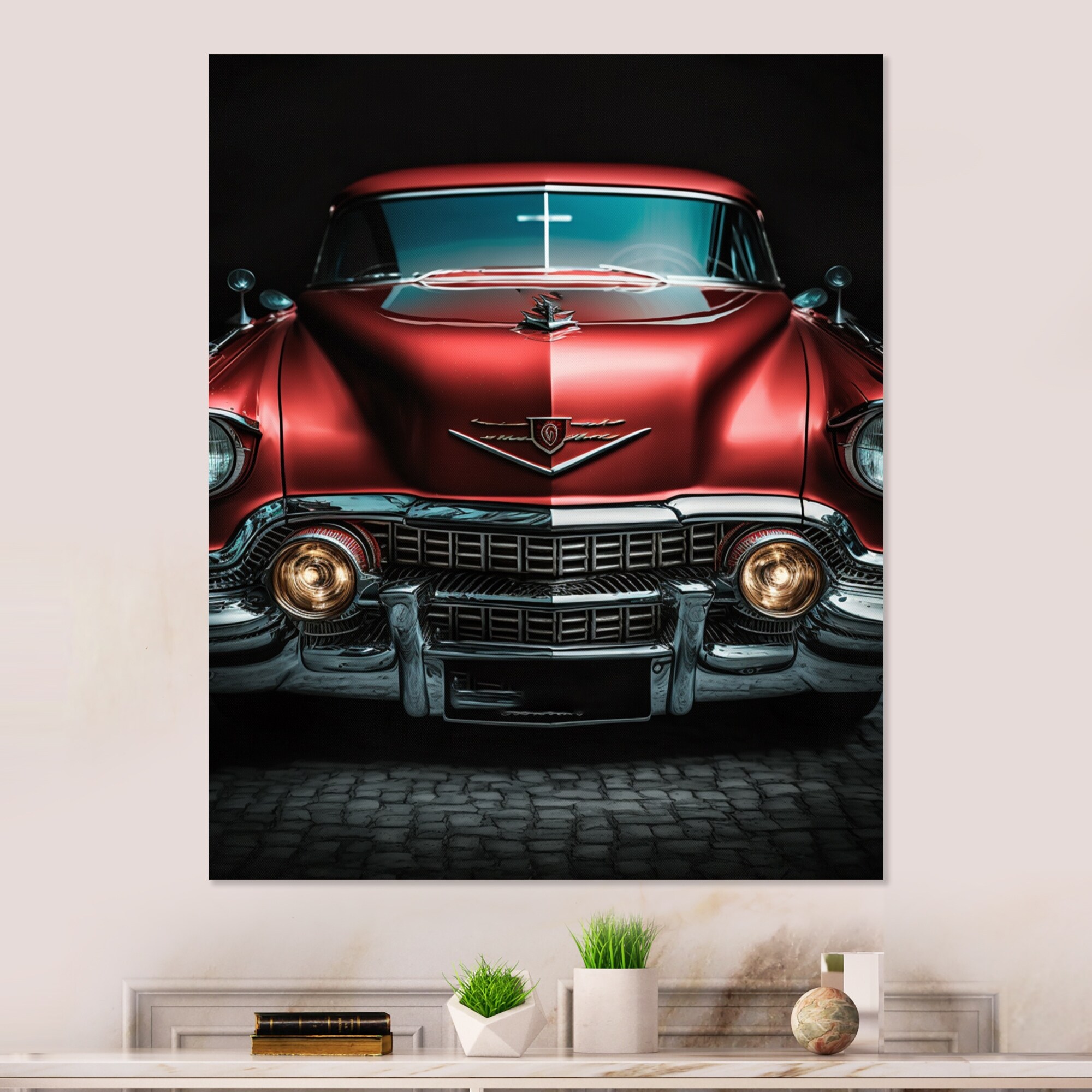 Designart "Red And Cream Essence of Retro Car Ii" Retro Car Framed Canvas Print