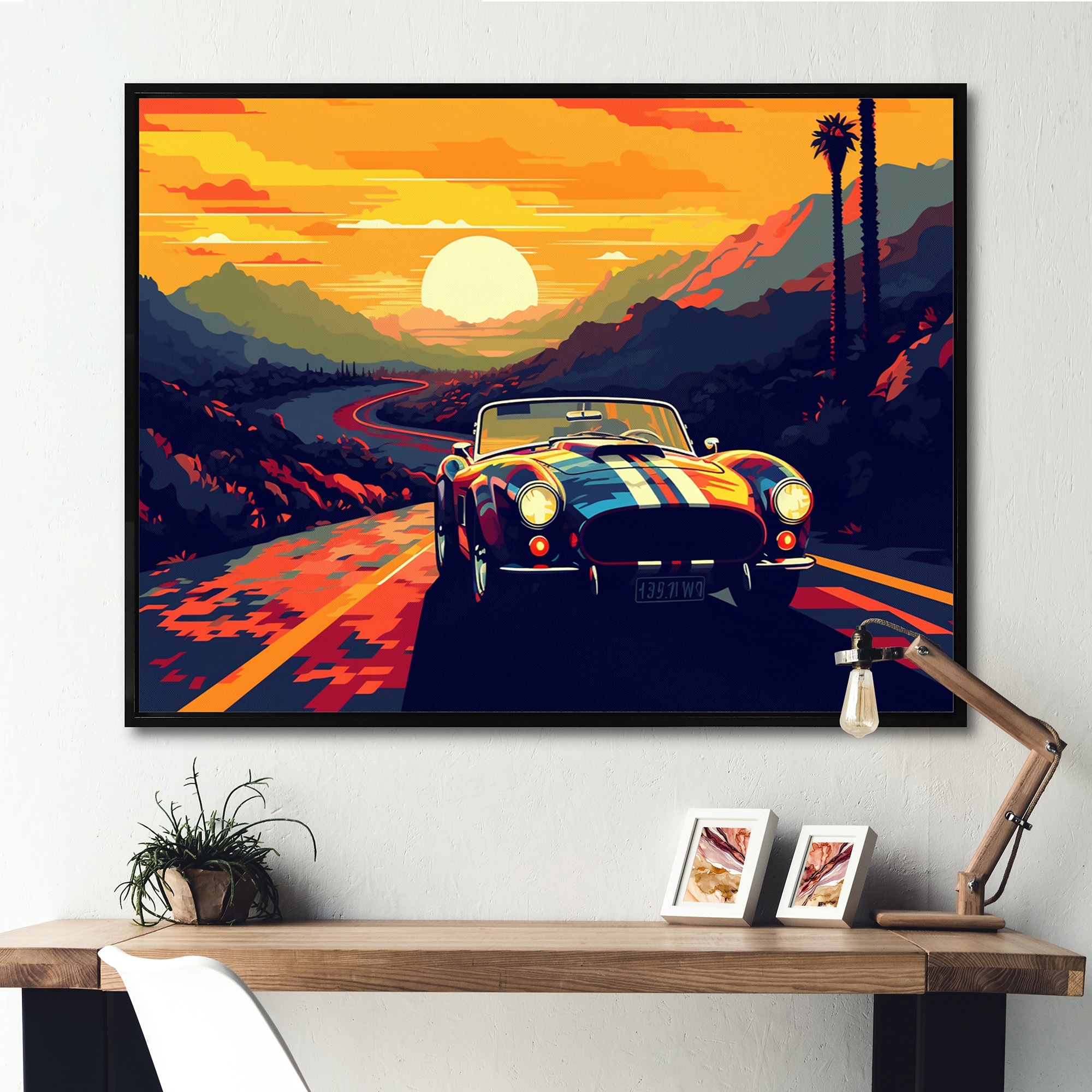 Designart "Vintage Retro Car During Golden Hour V" Retro Car Framed Canvas Wall Art Print