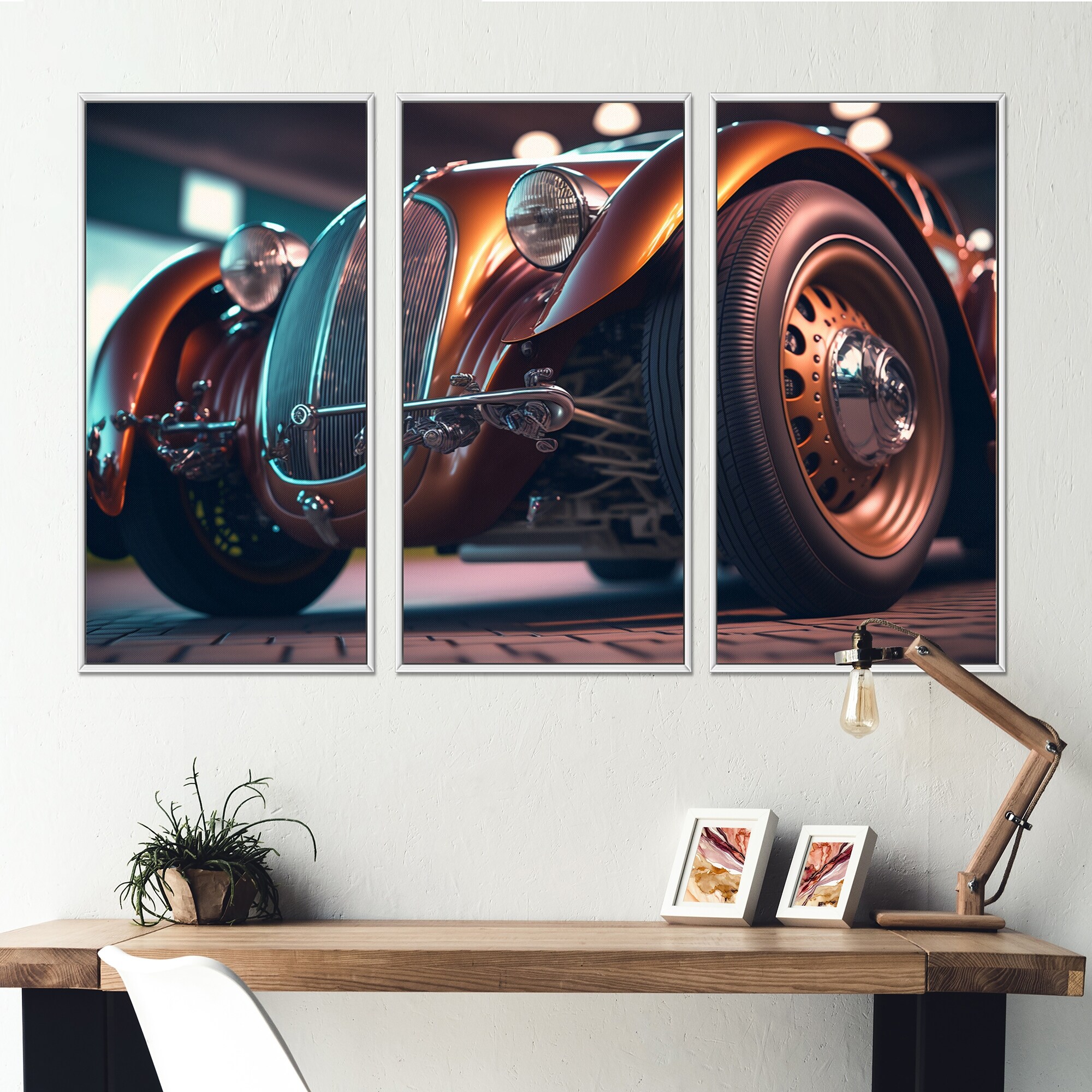 Designart "Vintage Retro Car During Golden Hour VIII" Retro Car Framed Canvas Wall Art Print - 3 Panels