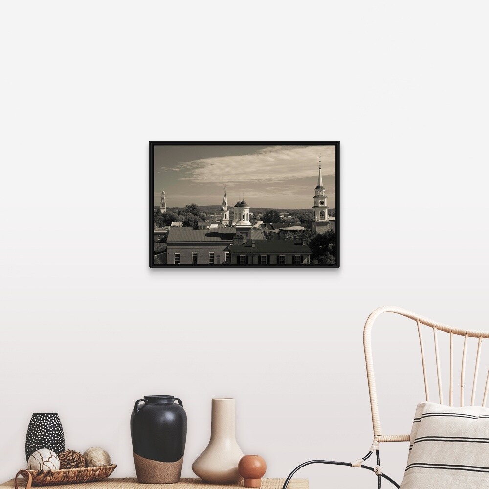 "High angle view of town churches, Frederick, Frederick County, Maryland" Black Float Frame Canvas Art