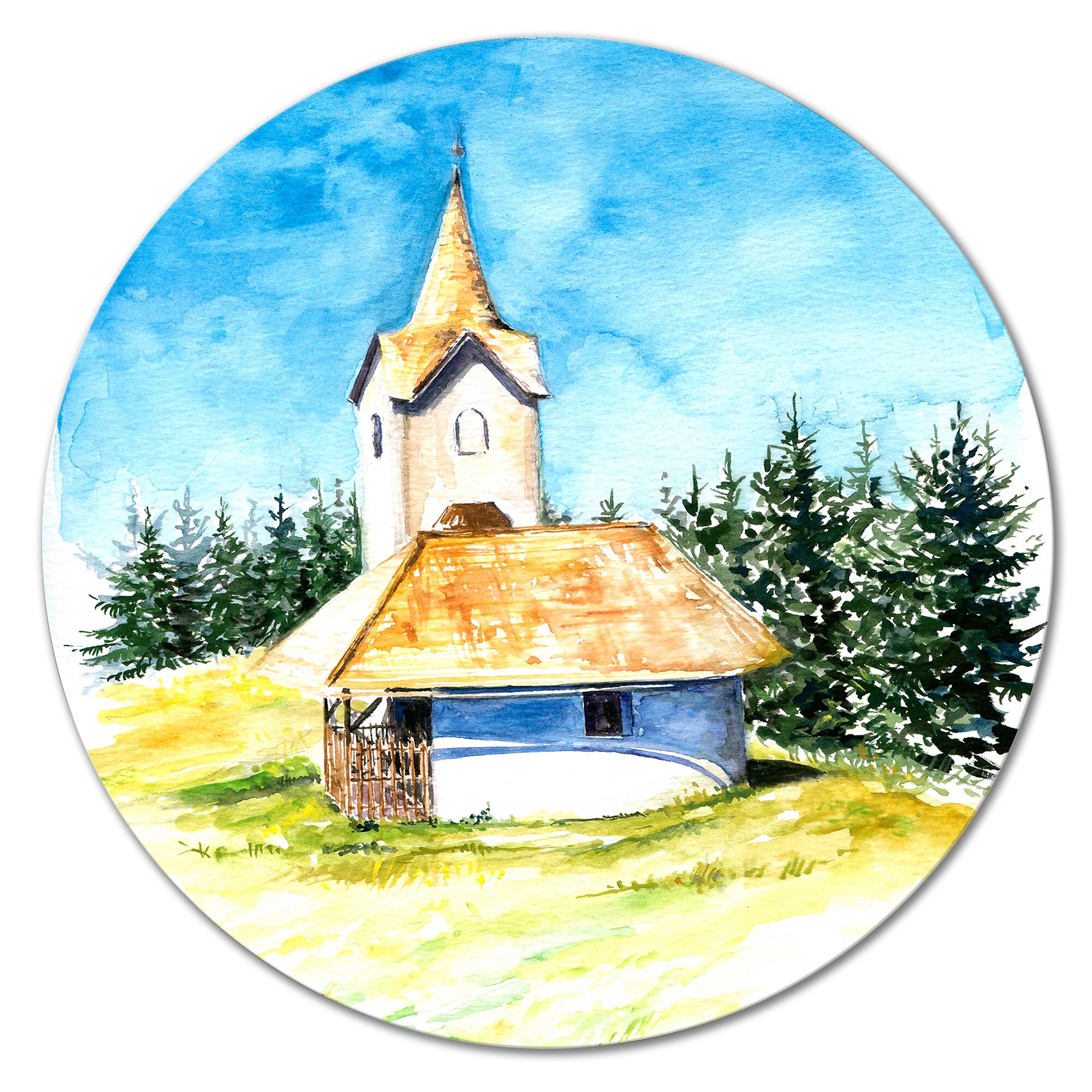 Designart 'Little Village Church in the Pine Trees I' Mid-Century Modern Metal Circle Wall Art