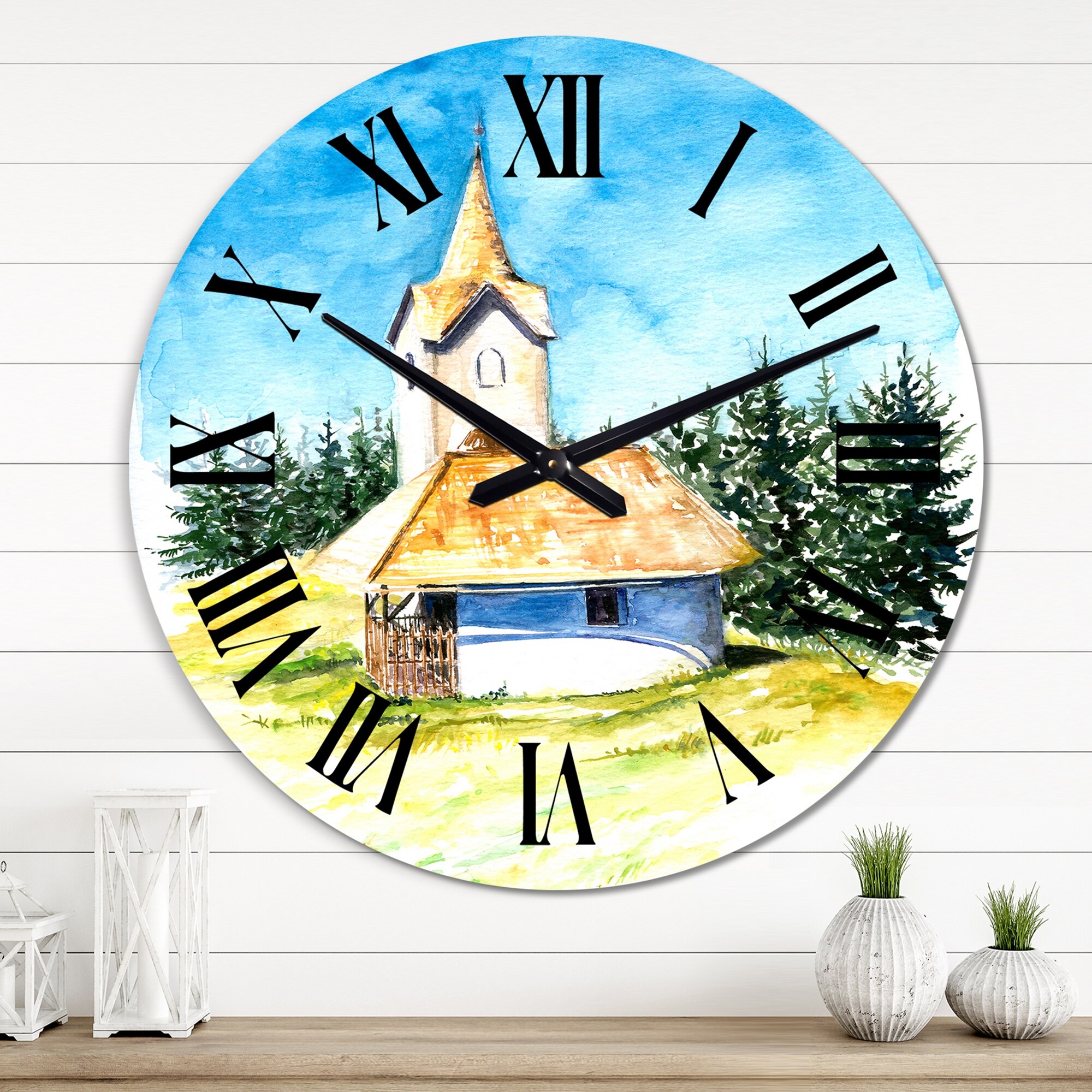 Designart 'Little Village Church in the Pine Trees I' Mid-Century Modern wall clock