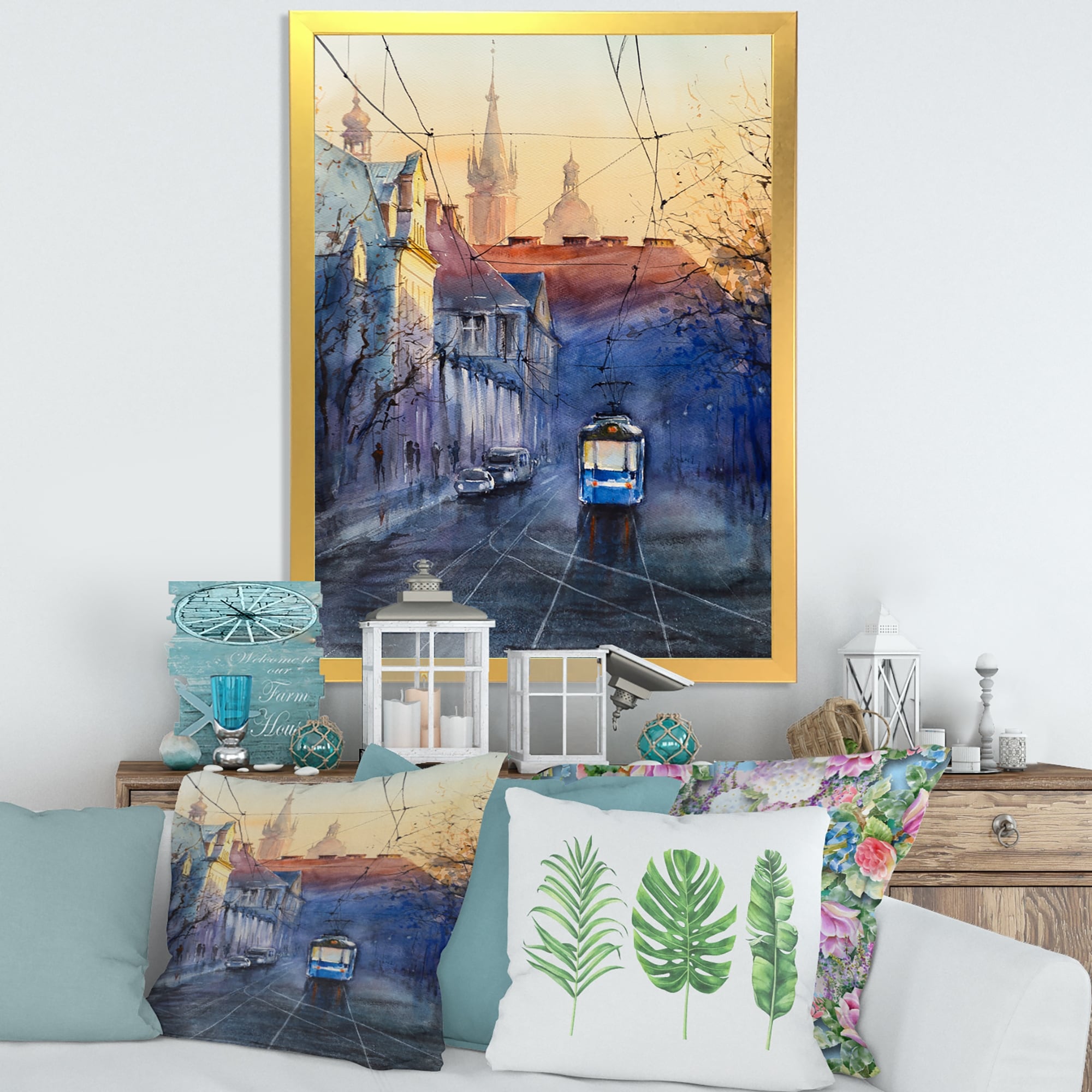 Designart "Blue Tram At Sunset With Church During Sunset" Nautical & Coastal Framed Art Print