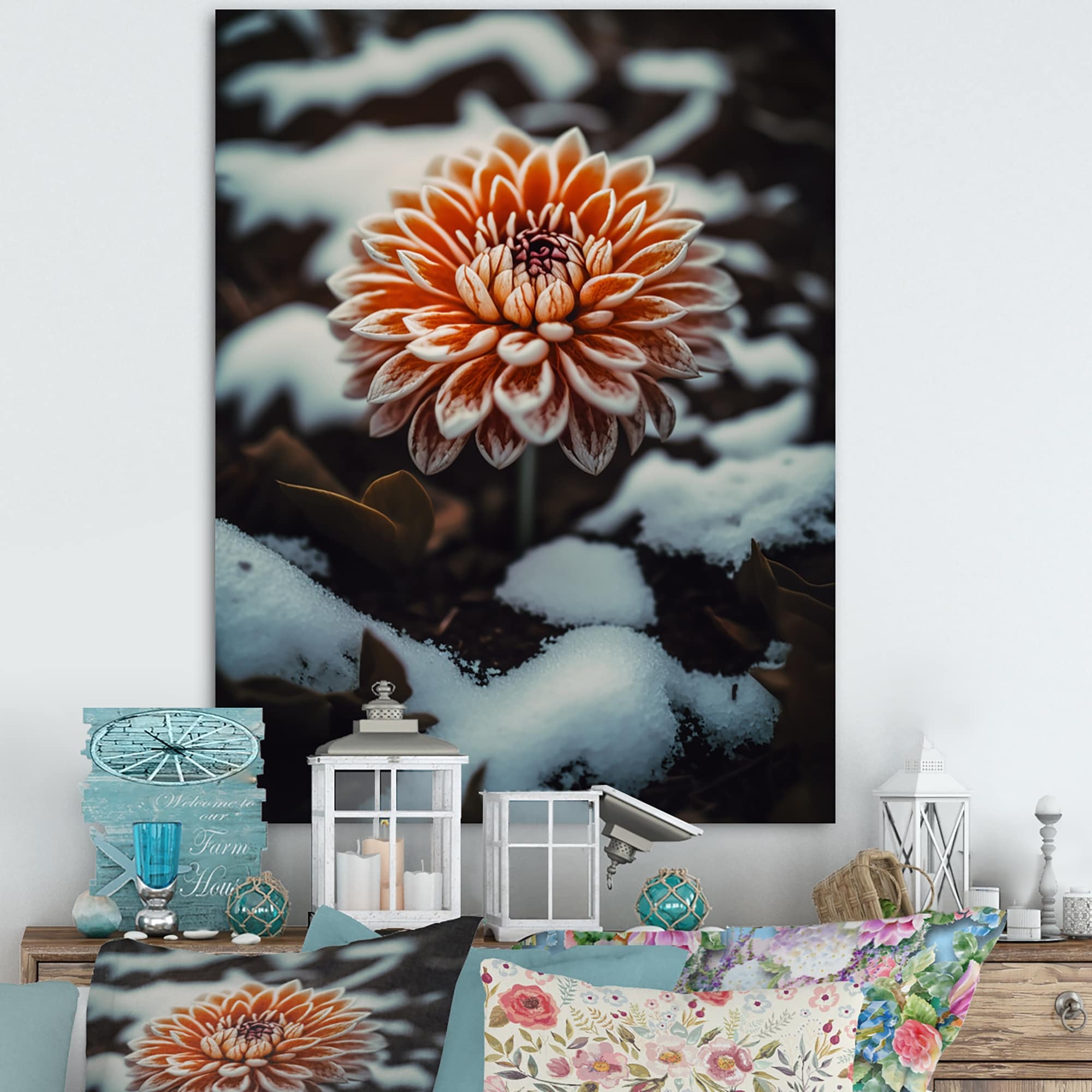 Designart 'A Blooming Orange Dahlia Flower in Winter IV' Floral & Botanical Canvas Wall Art
