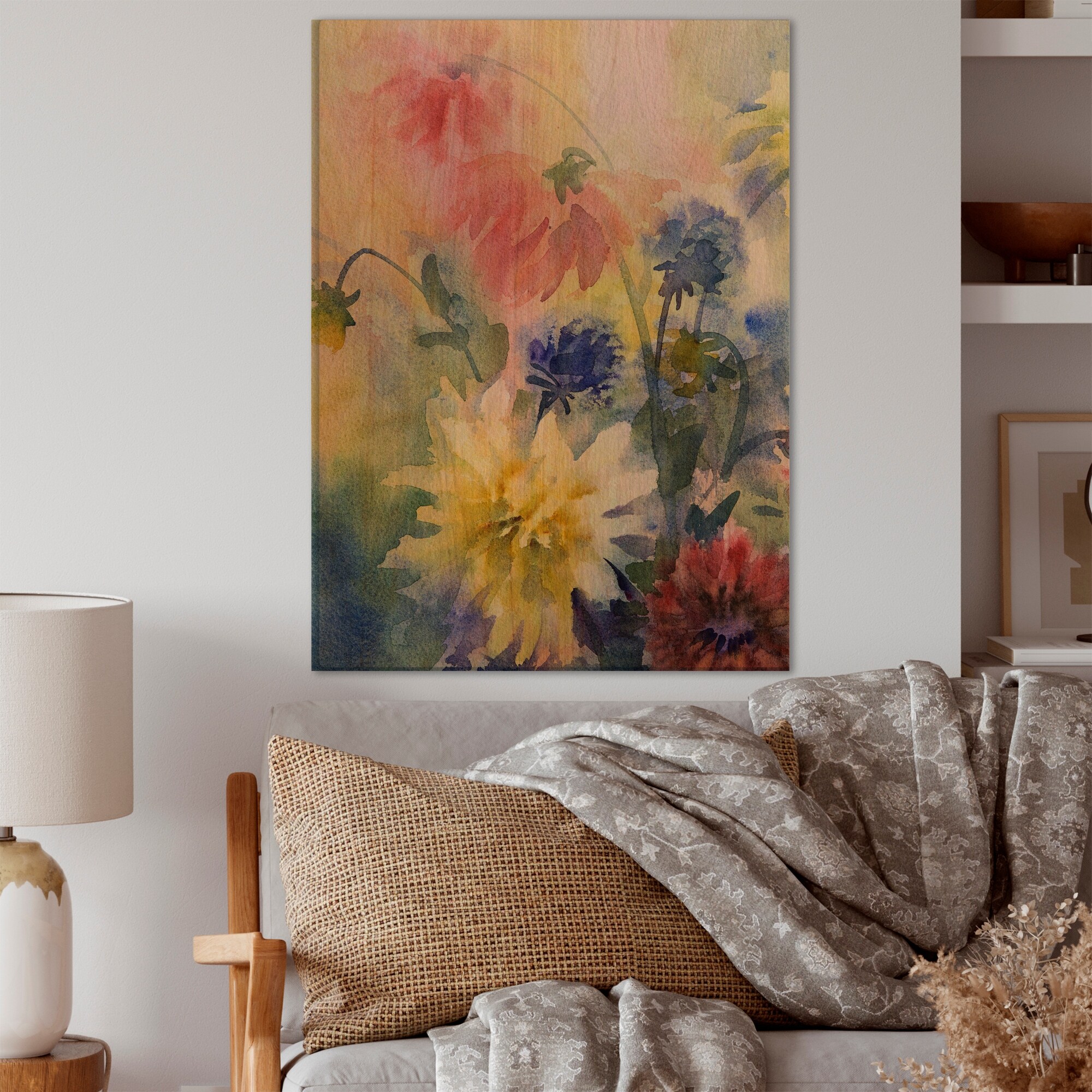 Designart 'Grunge Color Dahlias Flowers' Traditional Wood Wall Art Décor - Natural Pine Wood
