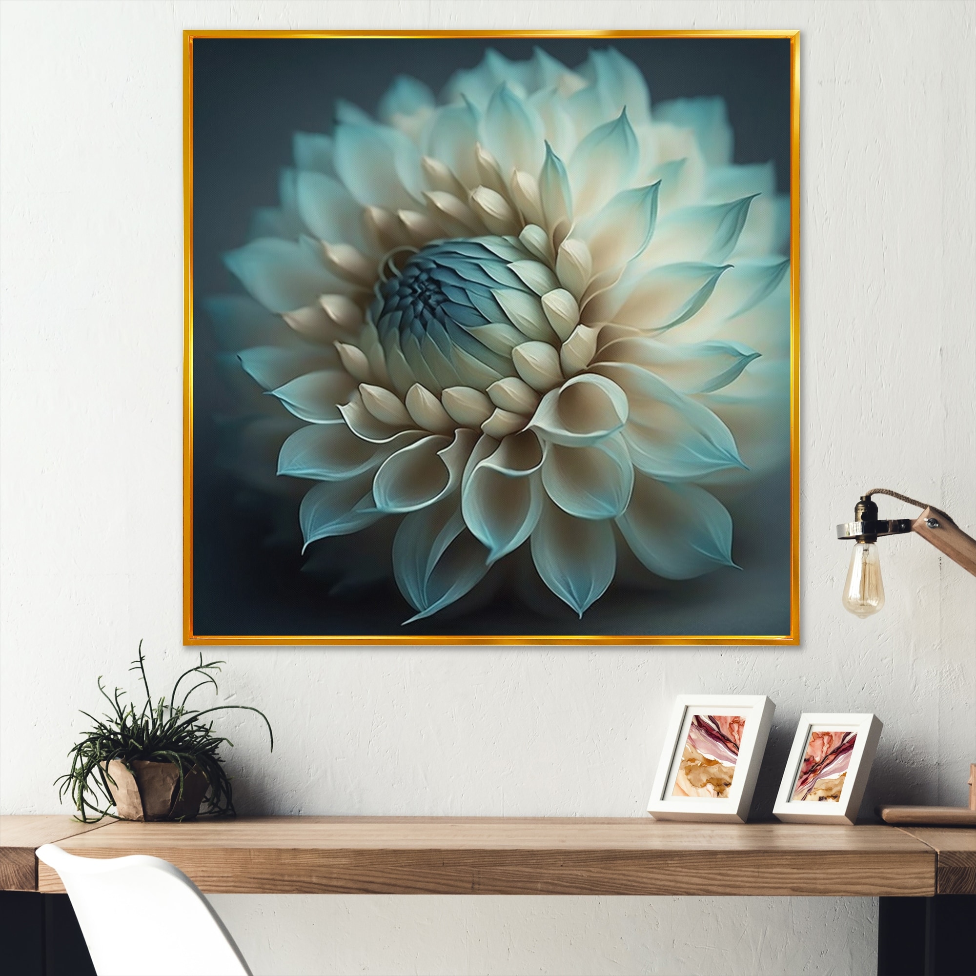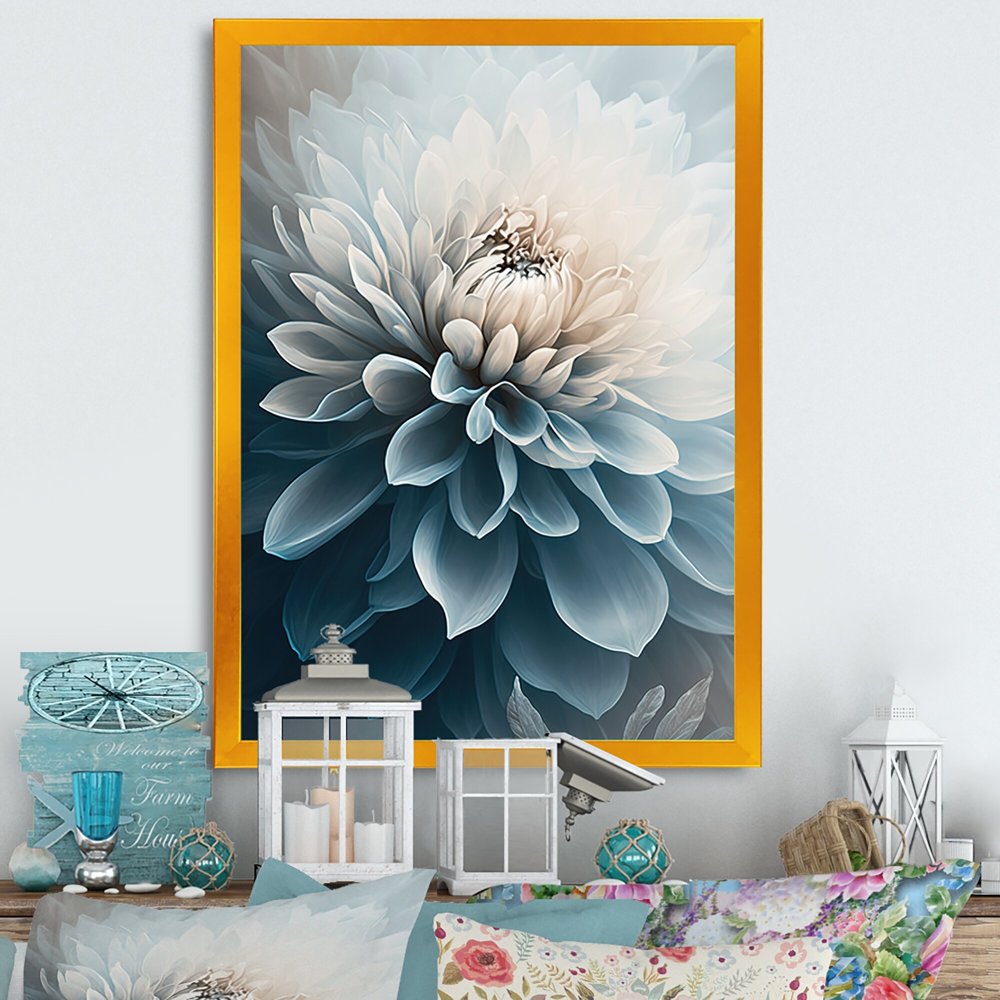 Designart "Blue And White Dahlia Flowers IV" Floral Dahlia Framed Canvas Art Print