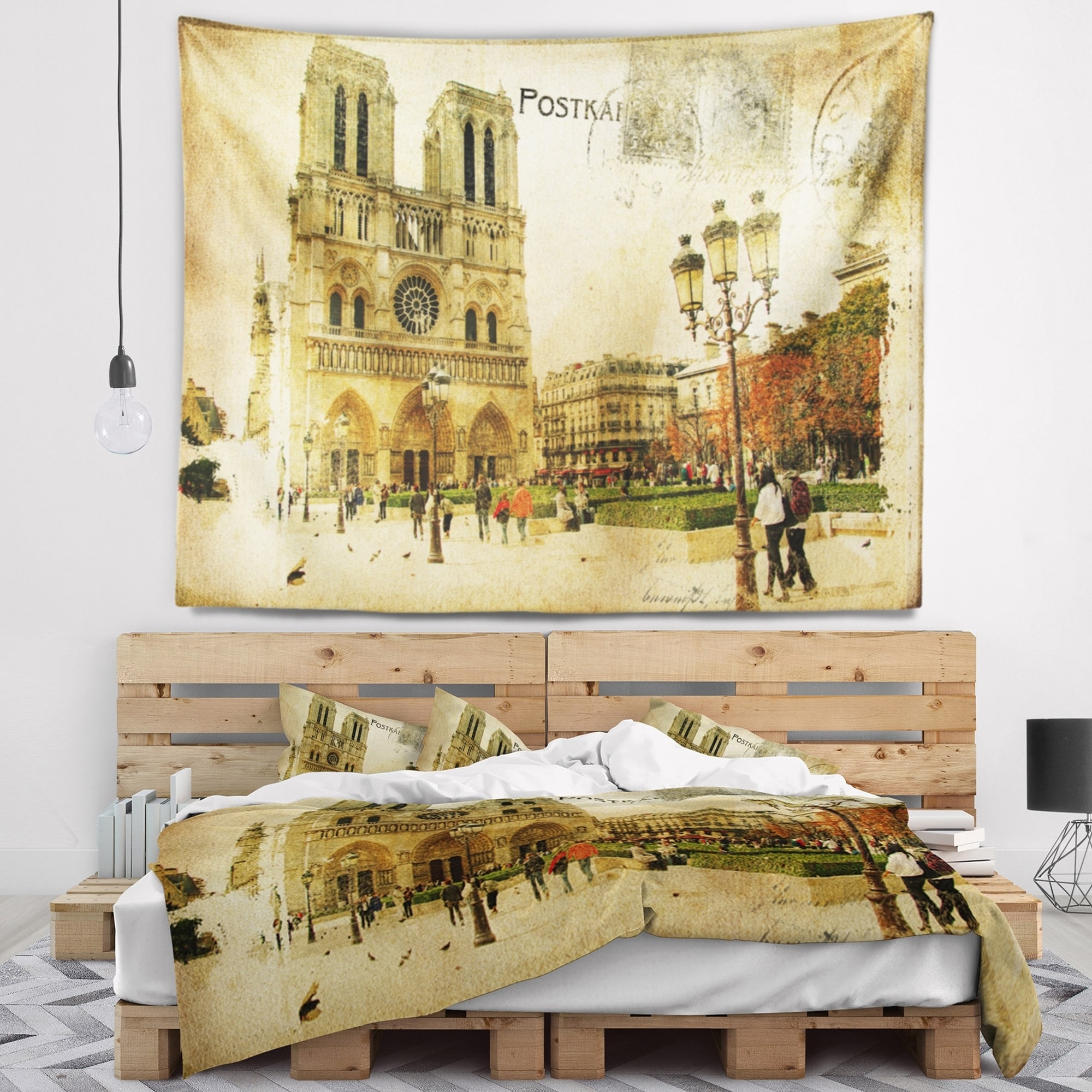 Designart 'Notre Dame Cathedral Vintage Card' Contemporary Wall Tapestry