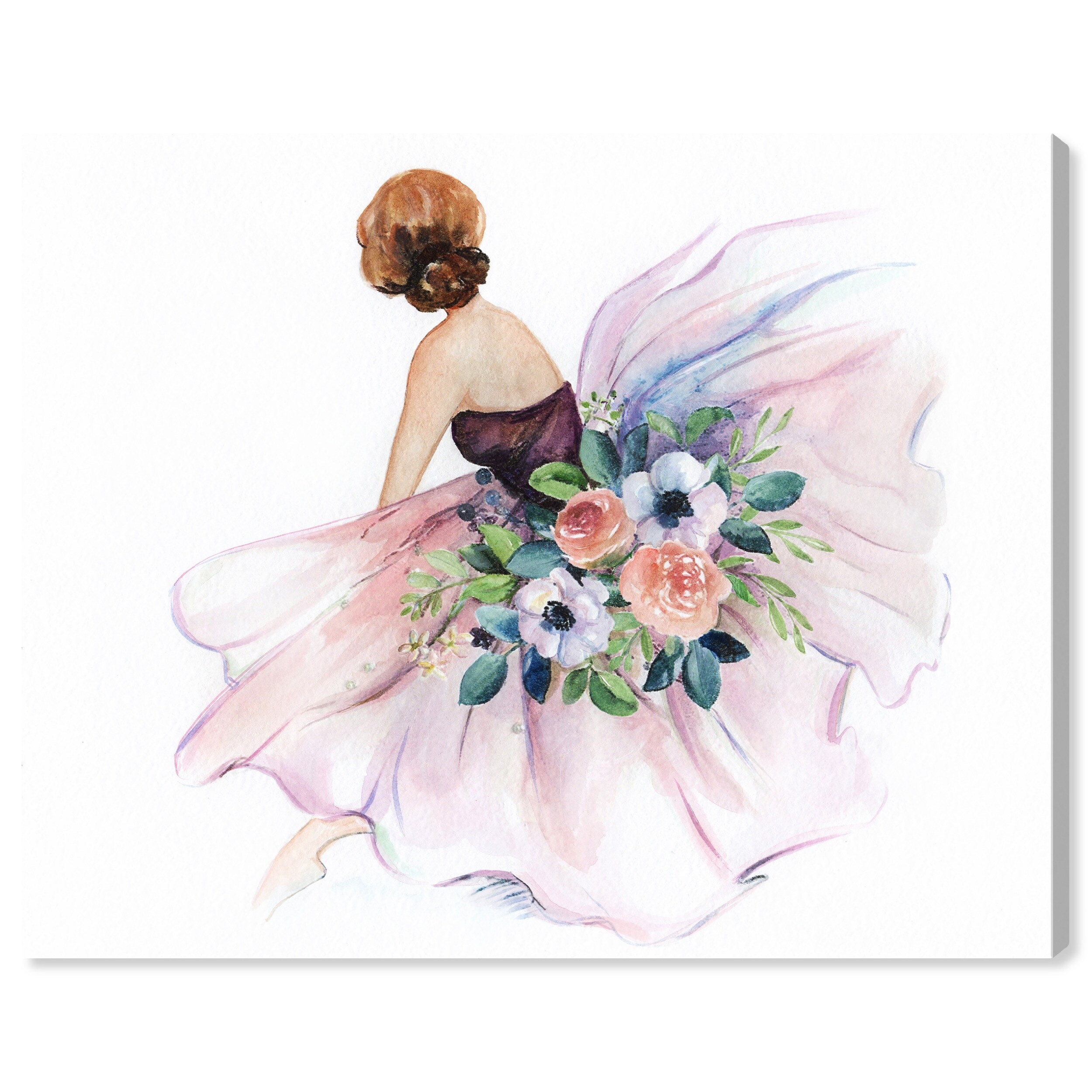 "Floral Ballet", Ballet Dancer Flowers Traditional Pink Canvas Wall Art Print for Bedroom