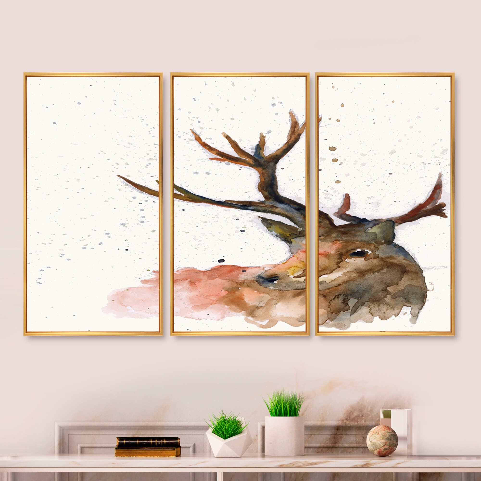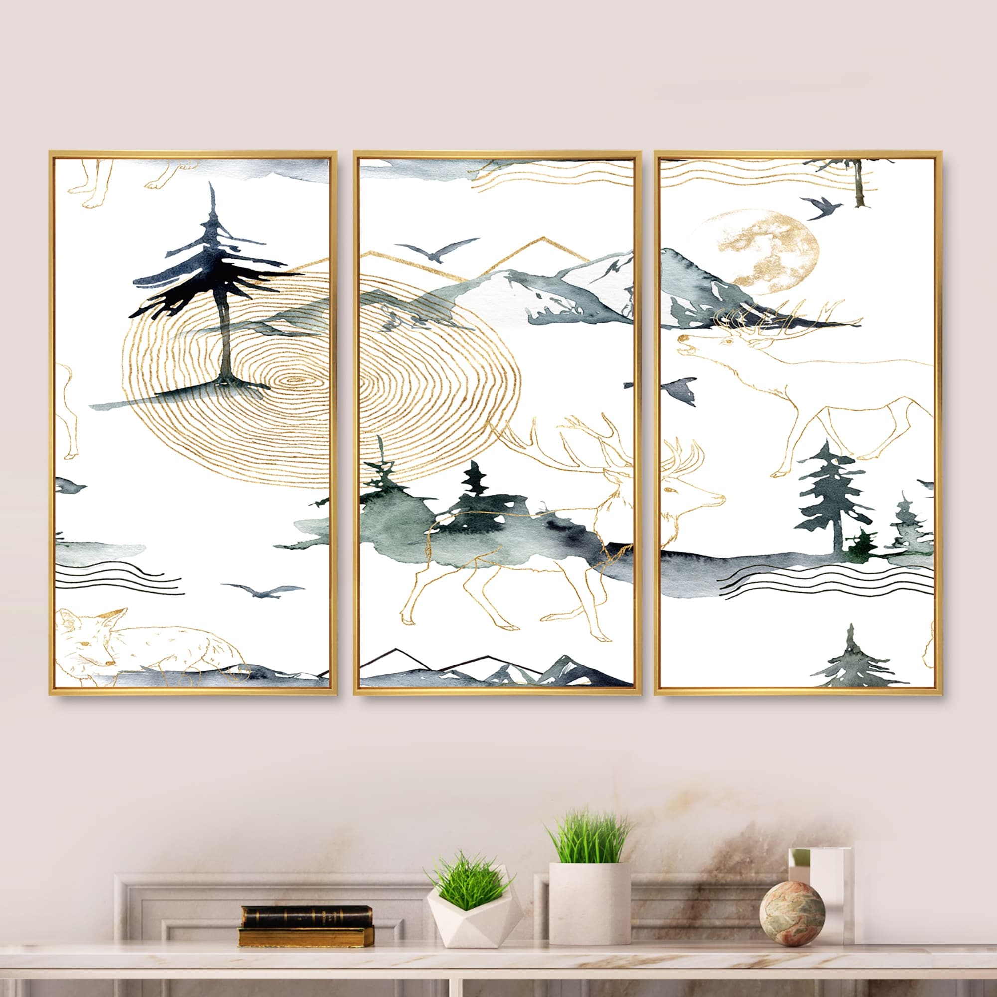 Designart "Minimalistic Gouache With Mountains Trees And Deer" Modern Framed Wall Decor Set of 3 - 4 Colors of Frames