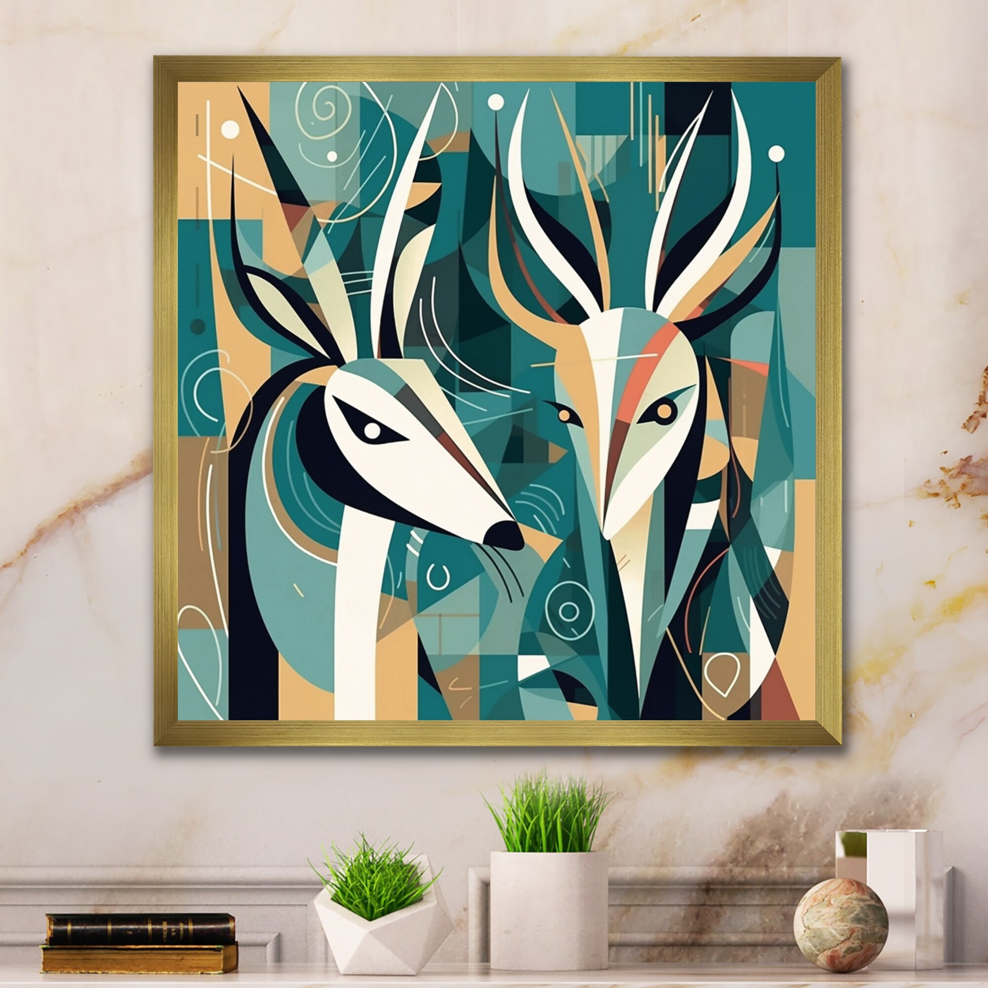 Designart "Green Beige Abstract Deer Portrait" Animals Deer Framed Wall Art for Living Room