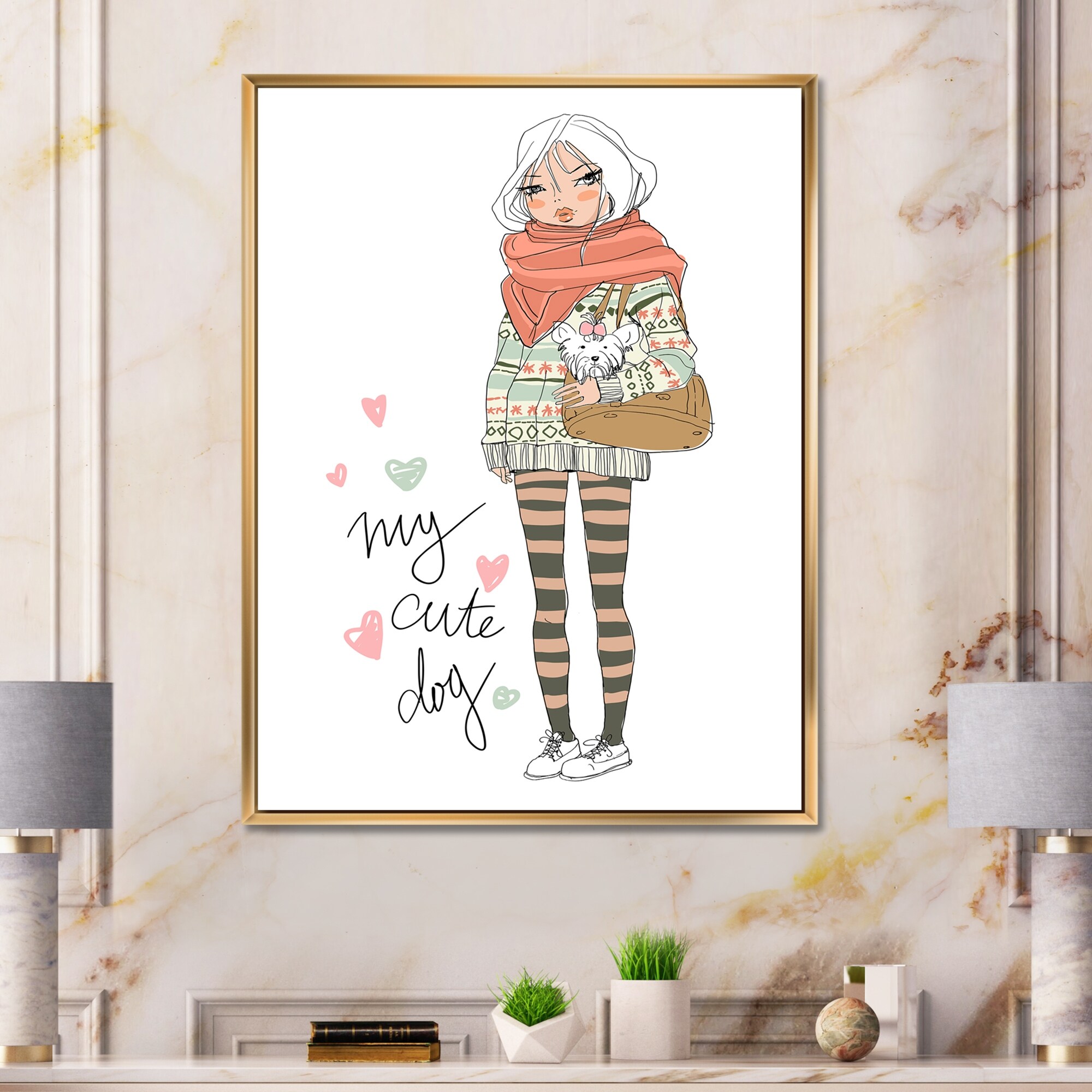 Designart "Cute Girl With Dog" Shabby Chic Framed Canvas Wall Art Print