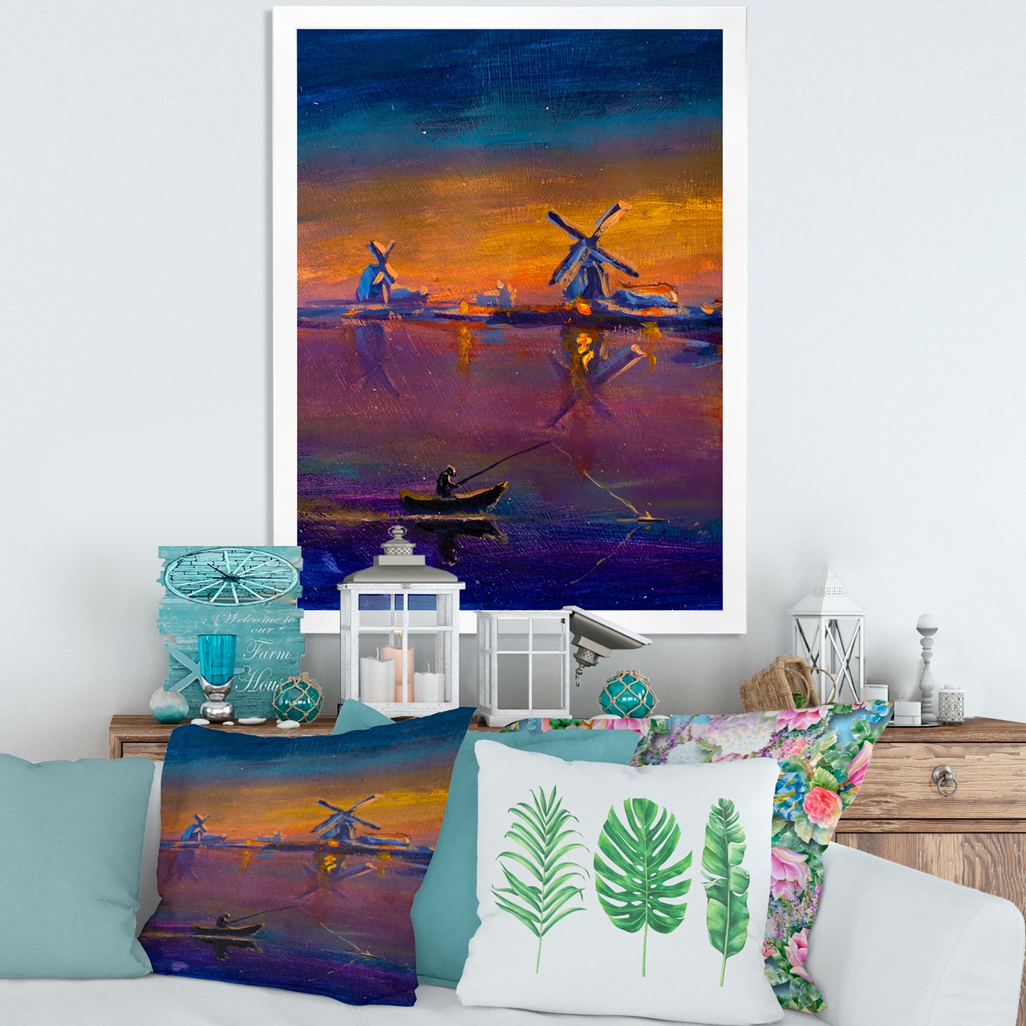 Designart "Evening Fishing Against the Traditional Windmill" Nautical & Coastal Framed Art Print