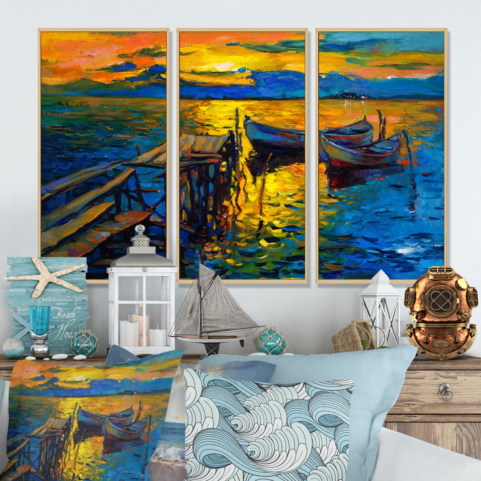Designart "Boat During Evening Glow At the Lake II" Nautical & Coastal Framed Art Set of 3 - 4 Colors of Frames