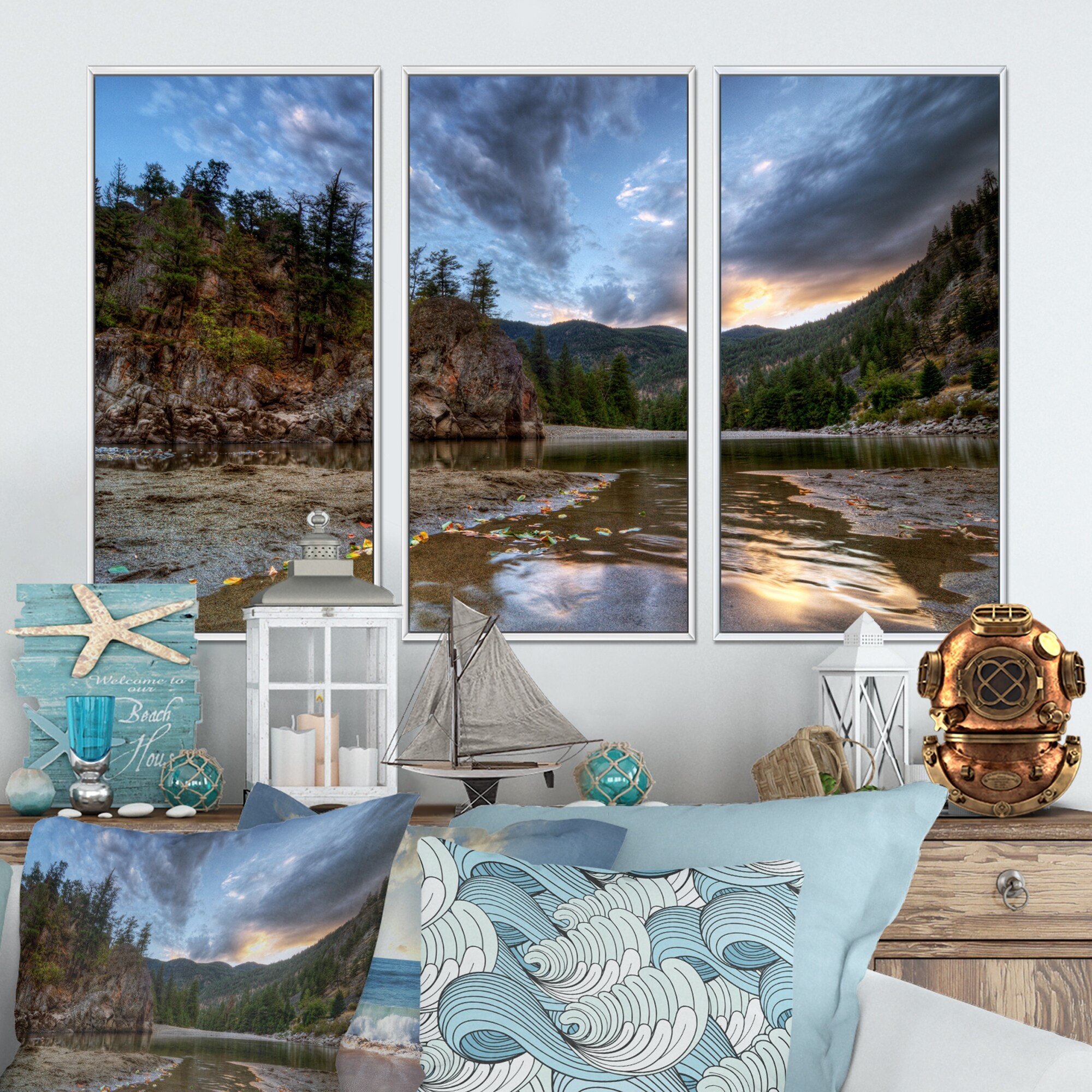 Designart "Sunset Evening Glow At the Lake I" Nautical & Coastal Framed Art Set of 3 - 4 Colors of Frames