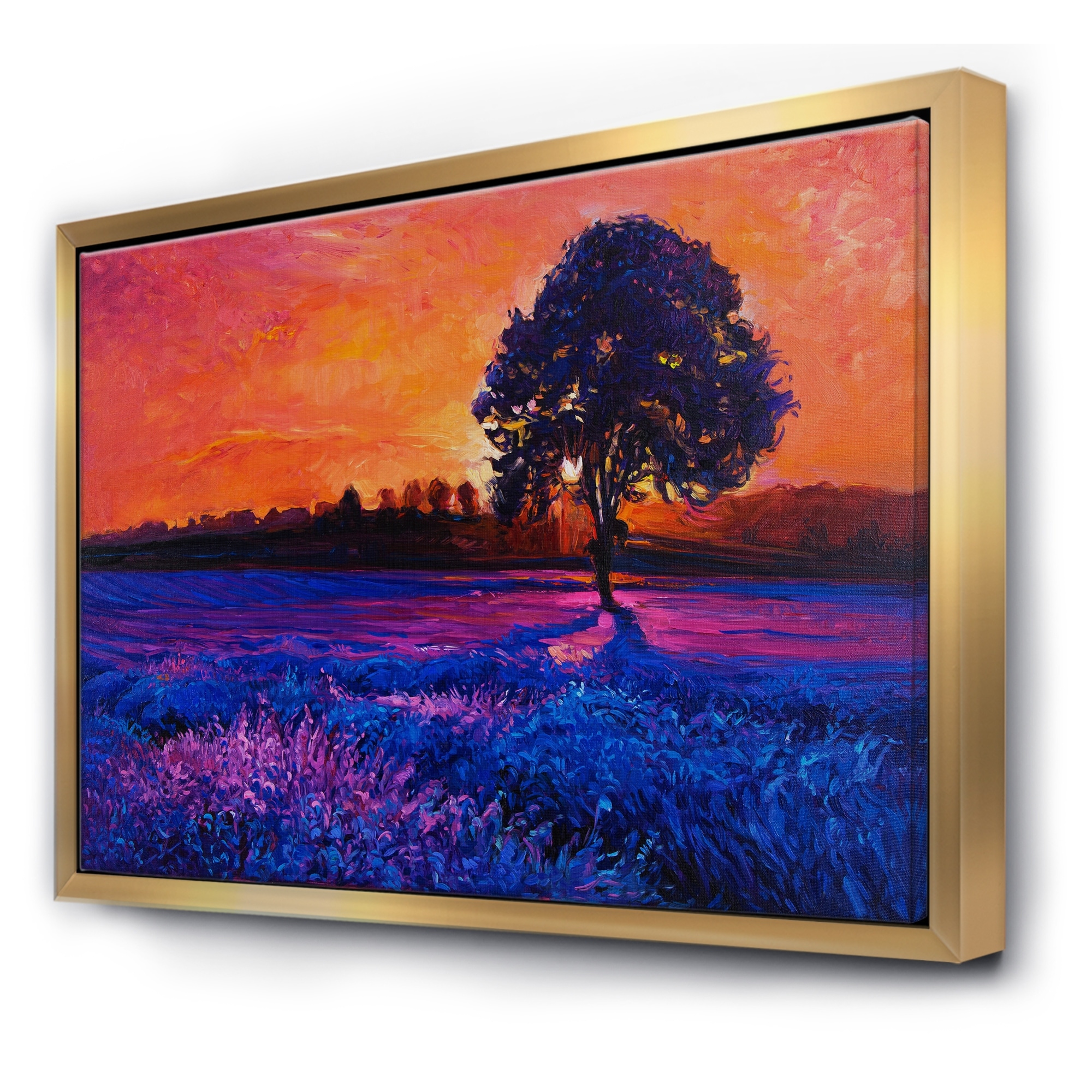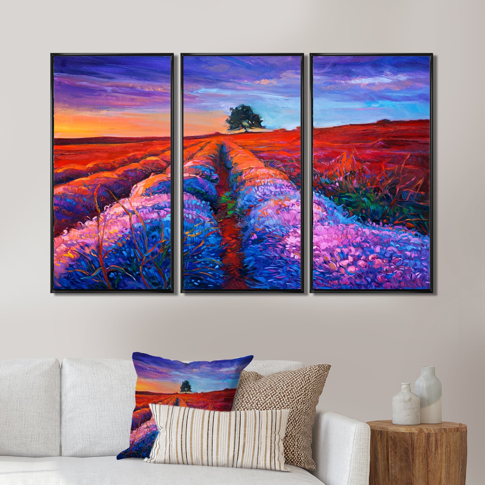 Designart "Lavender Fields With Distant Tree & Evening Glow" Farmhouse Framed Wall Decor Set of 3 - 4 Colors of Frames