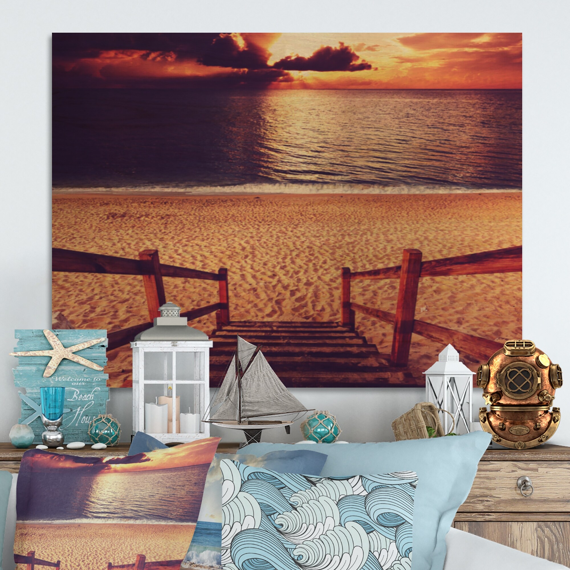 Designart 'Wood Boardwalk in Beach At Evening' Nautical & Coastal Wood Wall Art - Natural Pine Wood