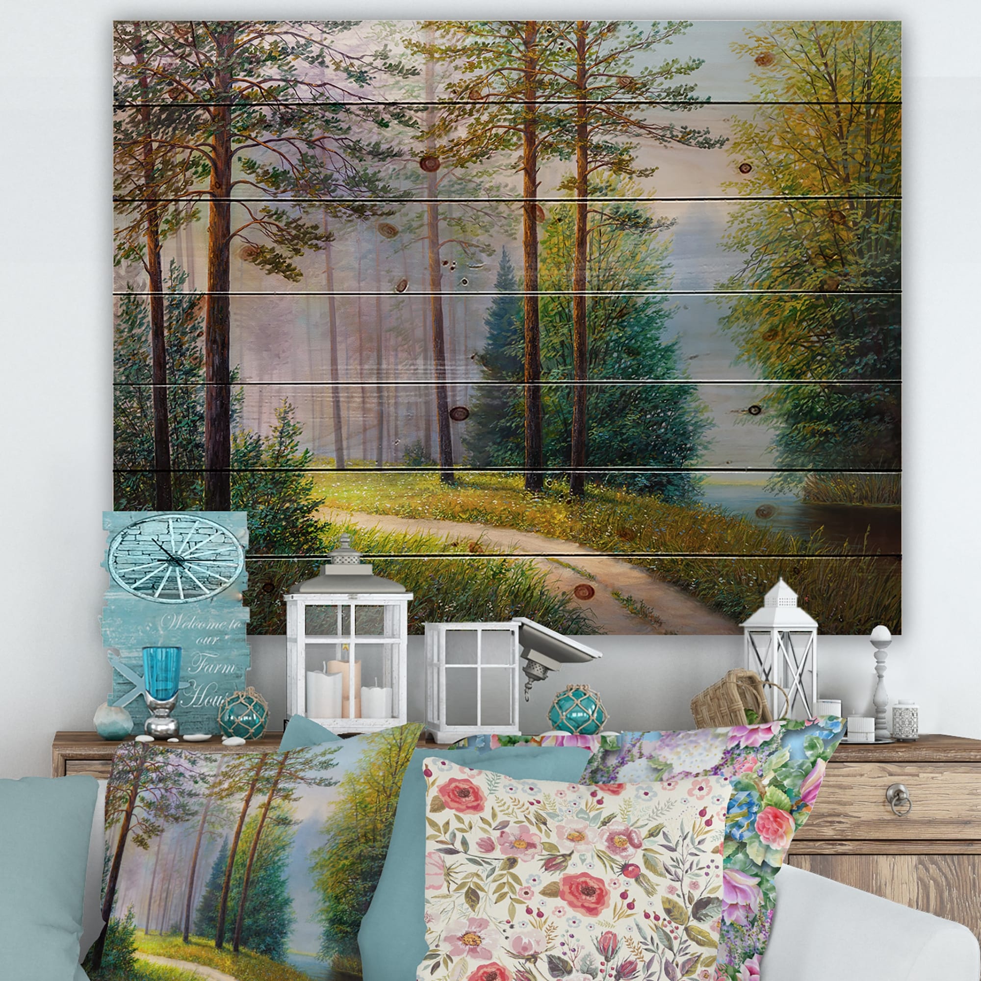 Designart 'Subtle Evening Light Through the Trees II' Lake House Print on Natural Pine Wood