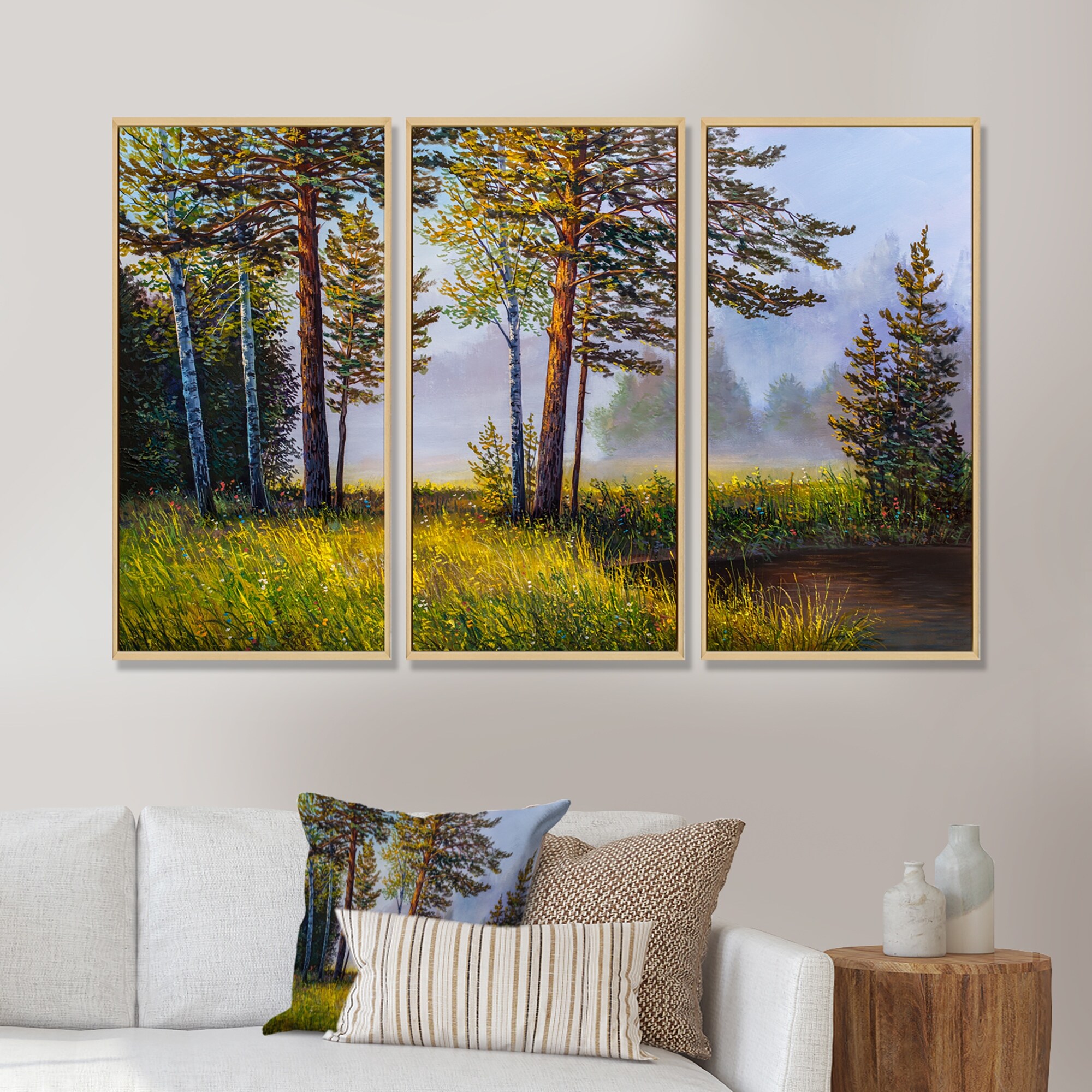 Designart "Subtle Evening Light Through the Trees III" Lake House Framed Canvas Wall Art Print Set of 3 - 4 Colors of Frames