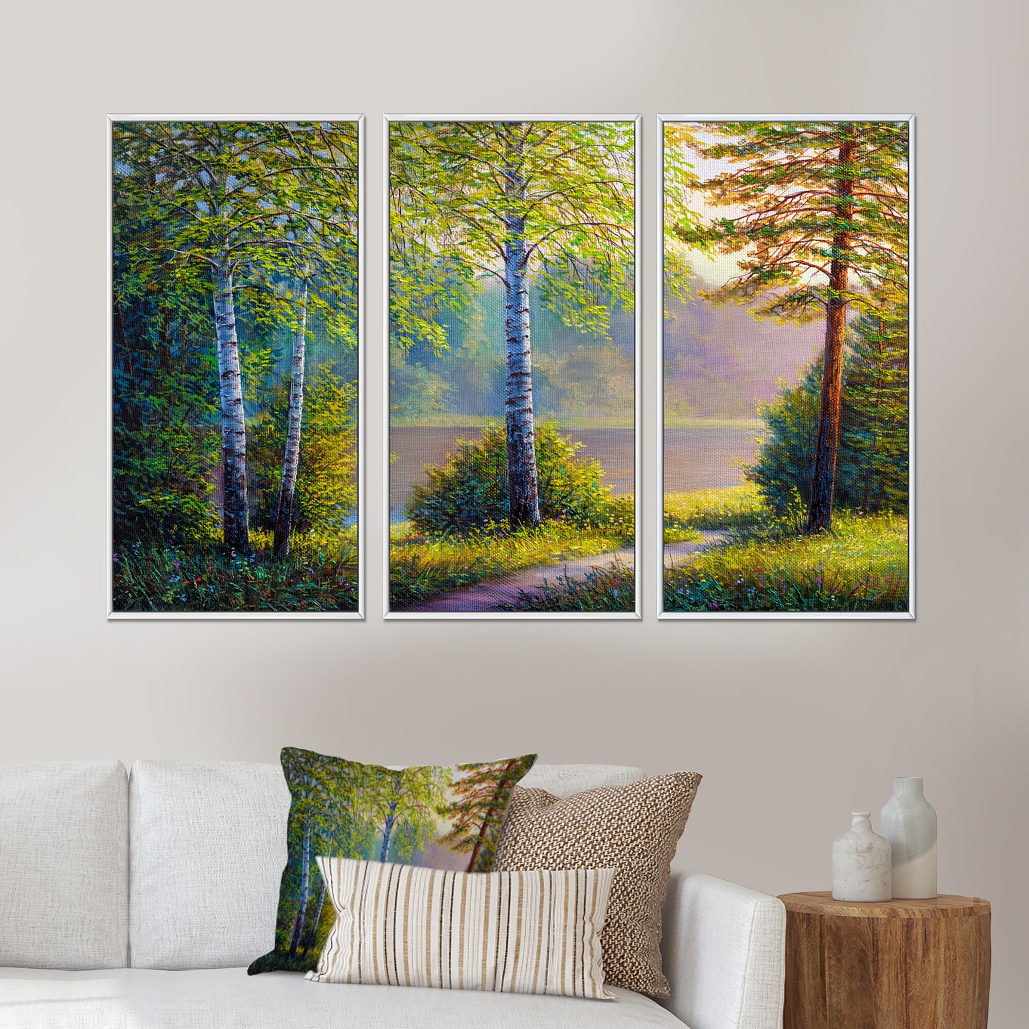 Designart "Subtle Evening Light Through the Trees II" Lake House Framed Artwork Set of 3 - 4 Colors of Frames