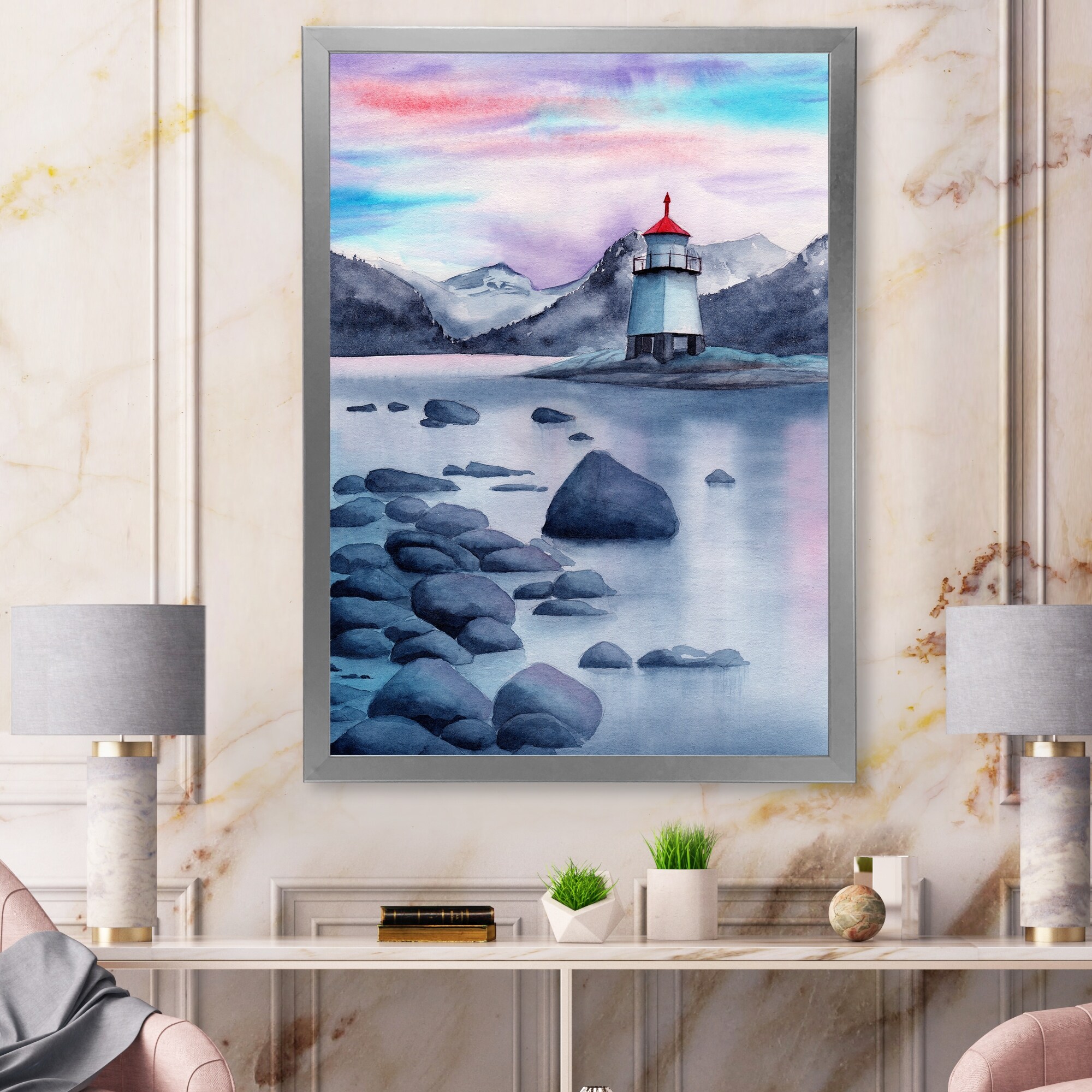 Designart "An Evening Landscape With A Lighthouse" Nautical & Coastal Framed Art Print