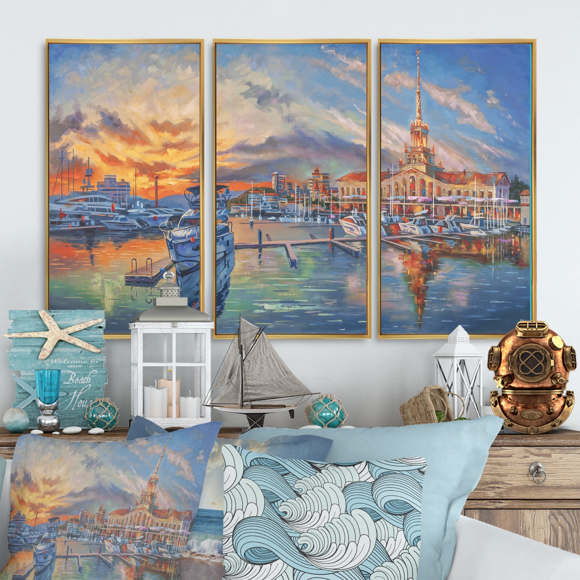 Designart "Evening In the Seaport" Nautical & Coastal Framed Art Set of 3 - 4 Colors of Frames