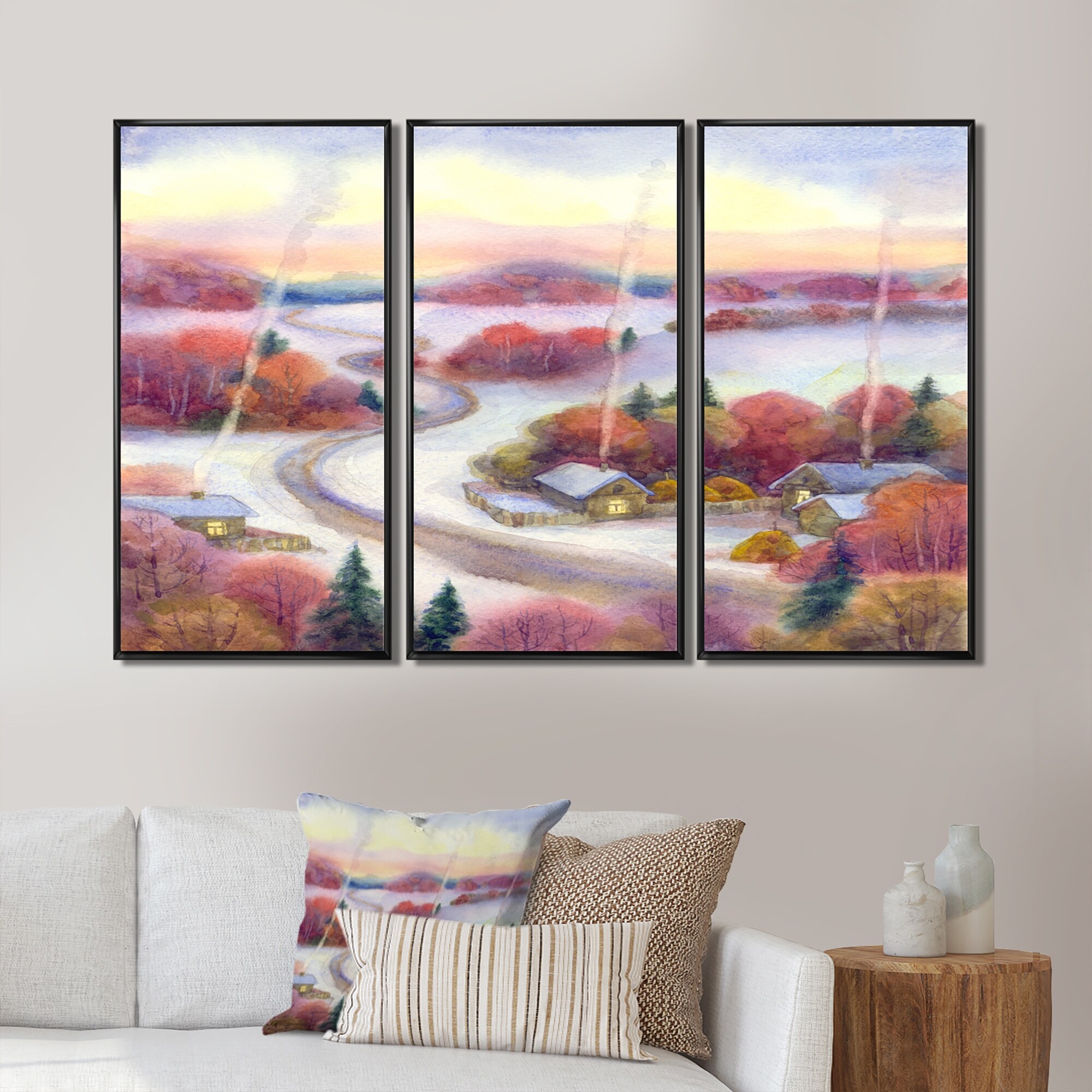 Designart "Winter Evening in the Village" Country Framed Artwork Set of 3 - 4 Colors of Frames