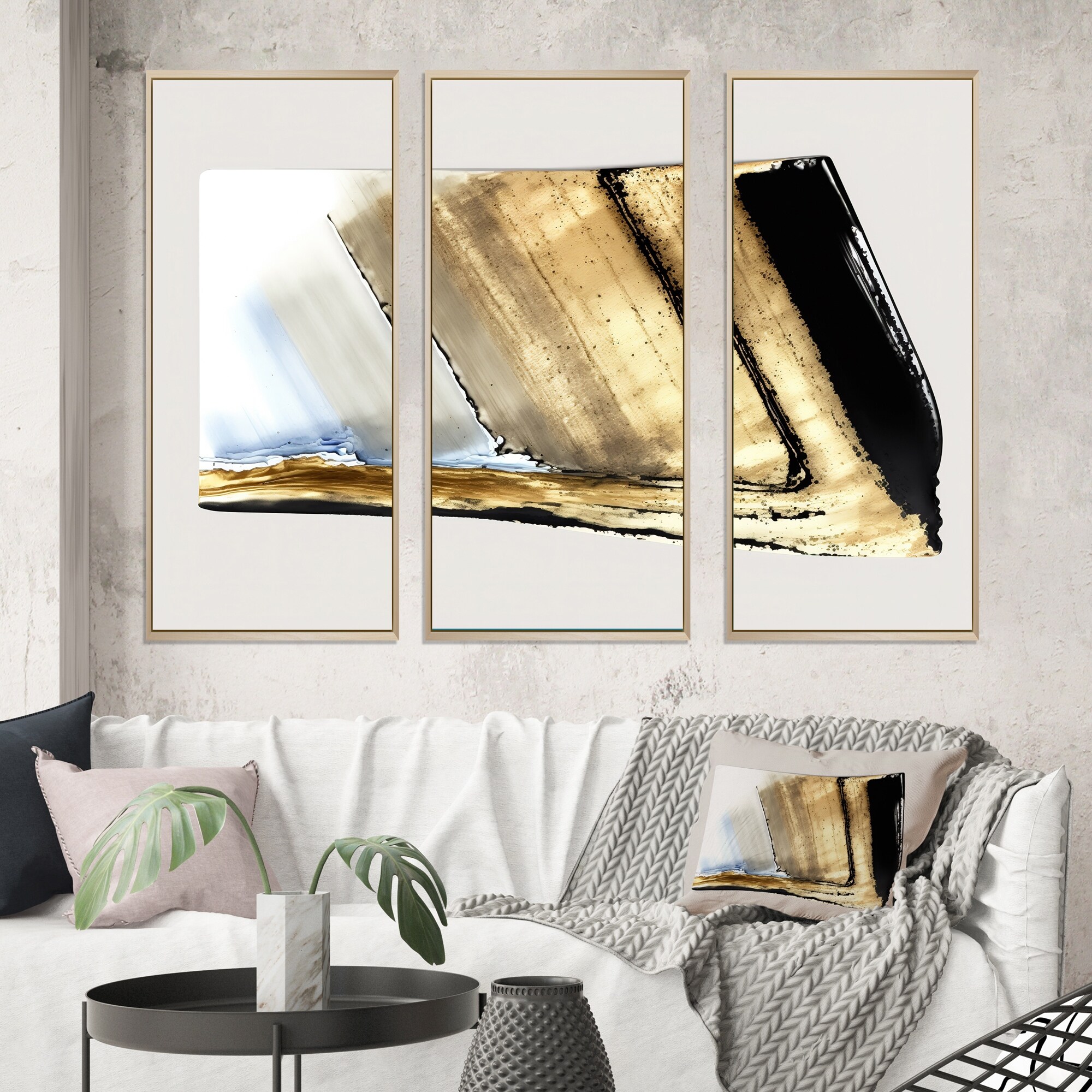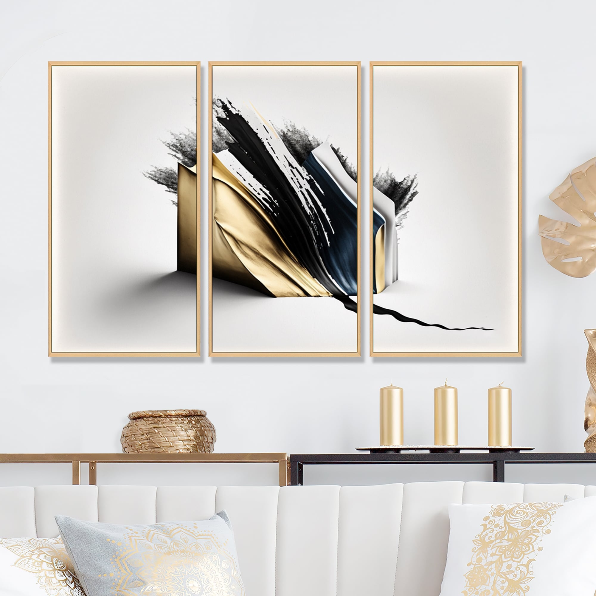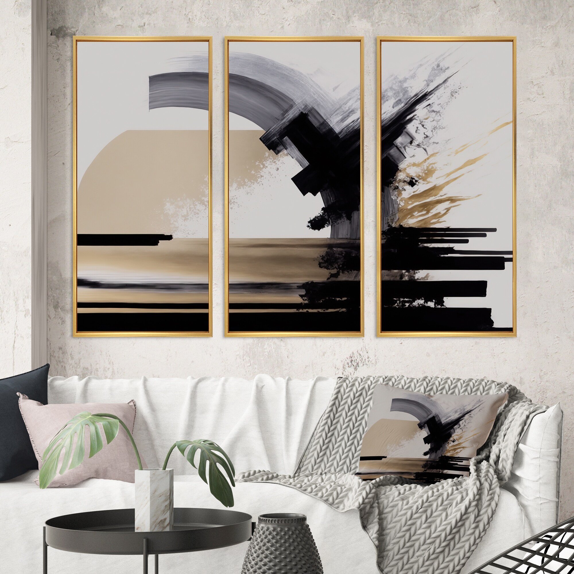 Designart "Black, White And Gold Expression IV" Modern Geometric Framed Canvas Art Print - 3 Panels