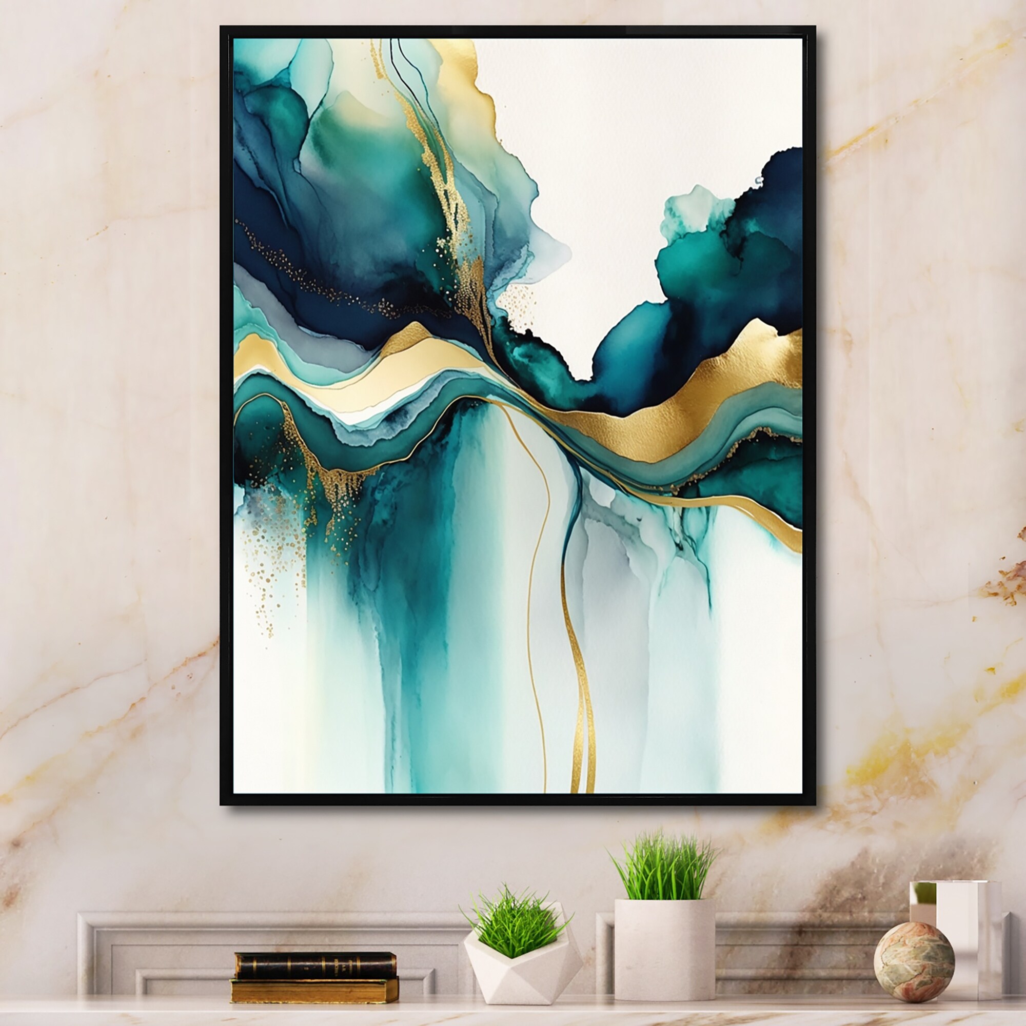 Designart "Gold And Green Marble Expression" Abstract Marble Framed Wall Decor