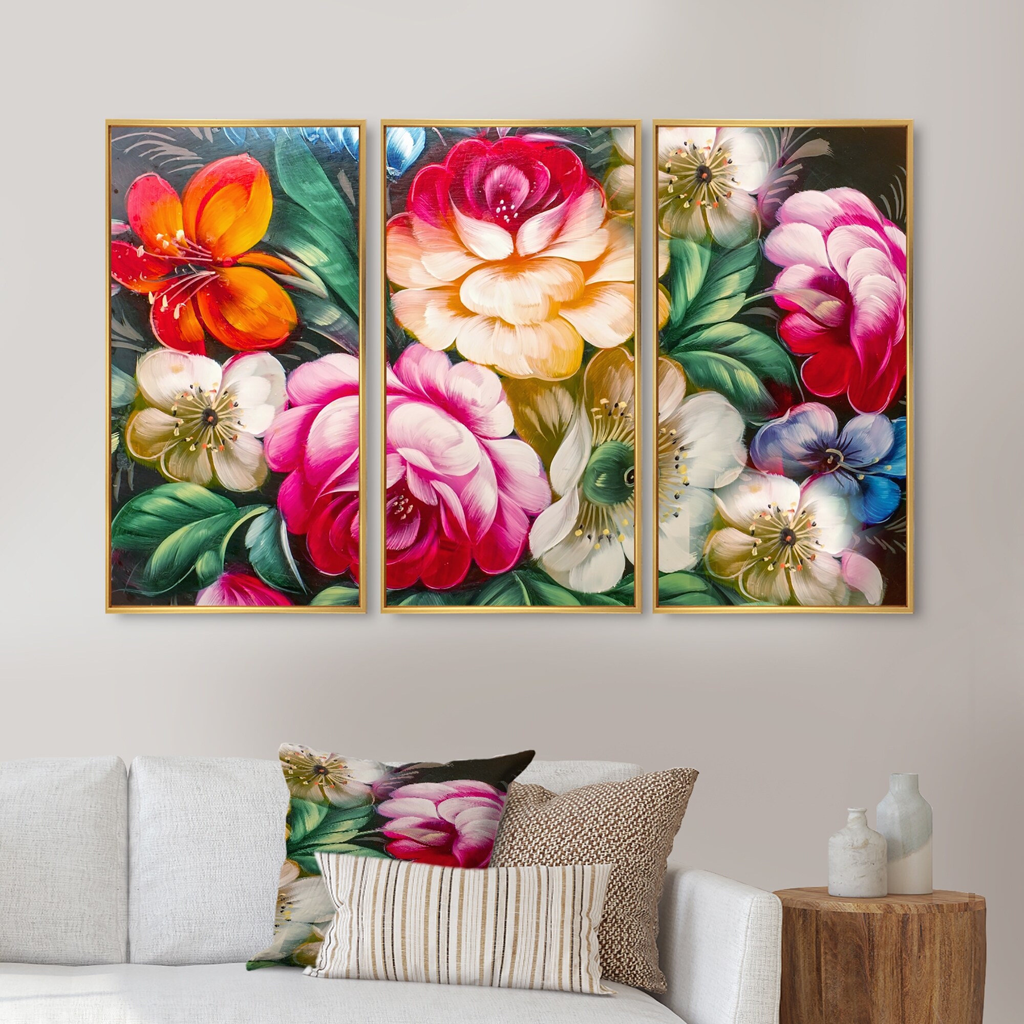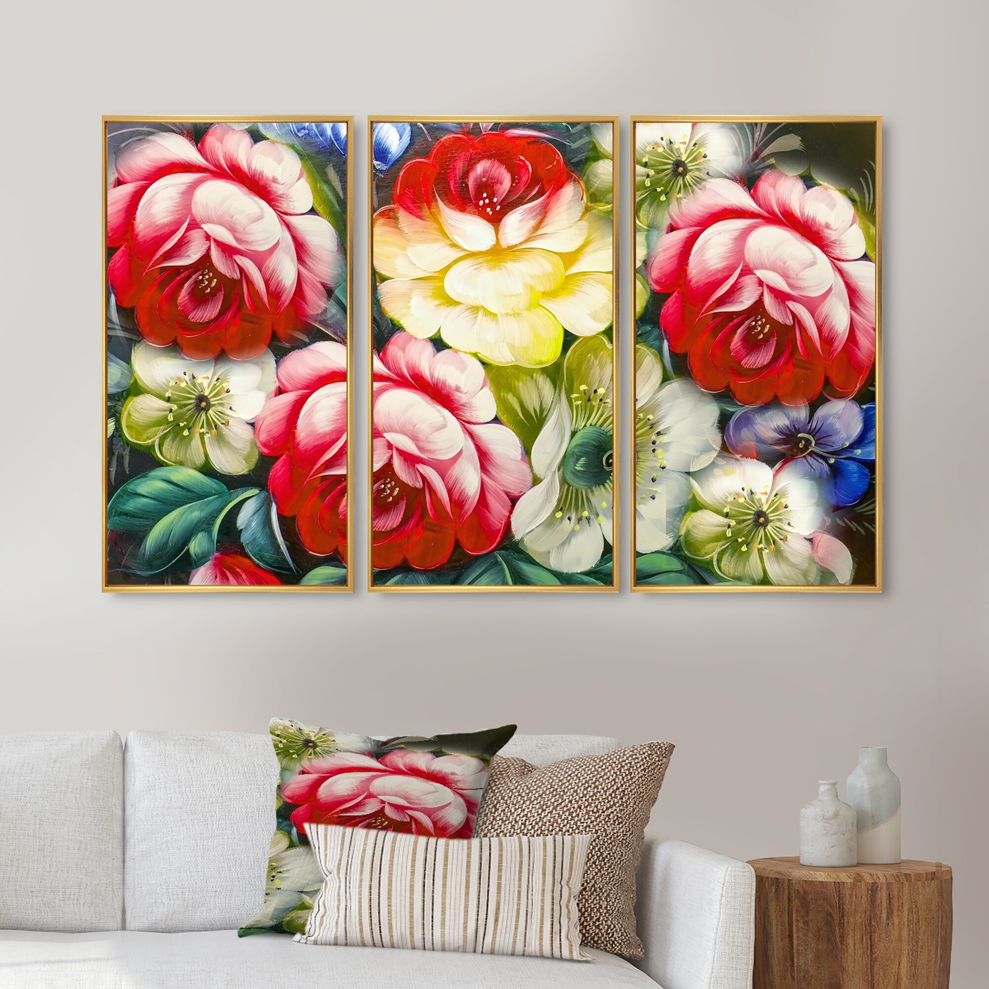 Designart "Vintage VIbrant Red & Yellow Flower Still Life II" Traditional Framed Canvas Wall Art Print - 3 Panels