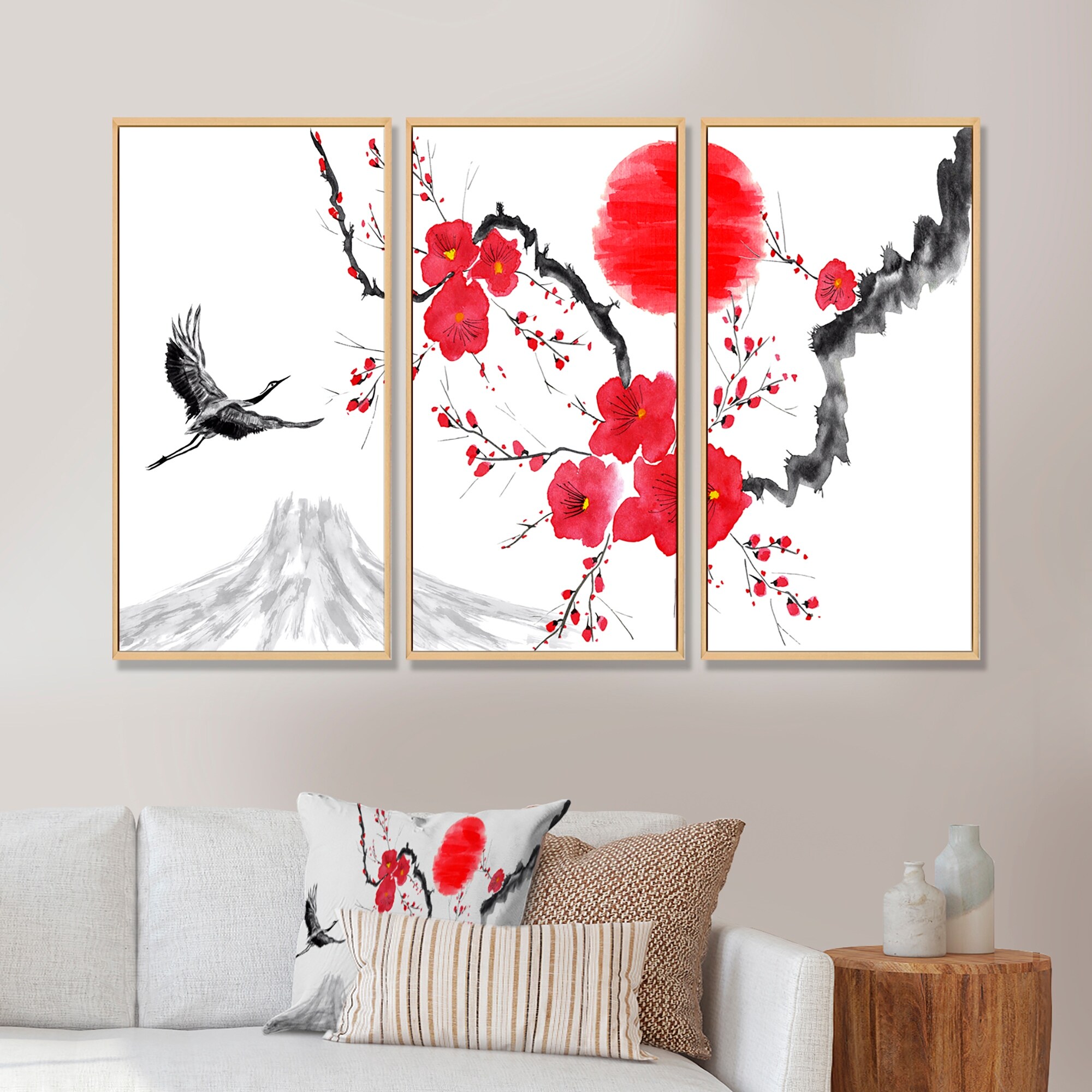 Designart "Blossoming Pink And Red Plum Flowers II" Traditional Framed Canvas Wall Art Set of 3 - 4 Colors of Frames