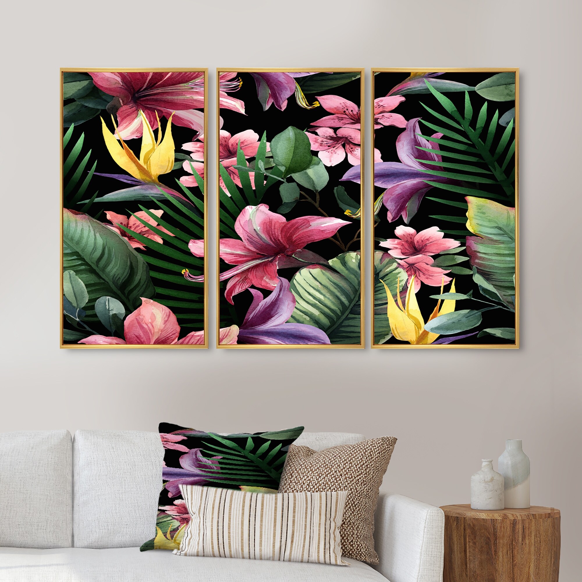 Designart "Yellow Red And Green Tropical Flowers on Black" Tropical Framed Artwork Set of 3 - 4 Colors of Frames