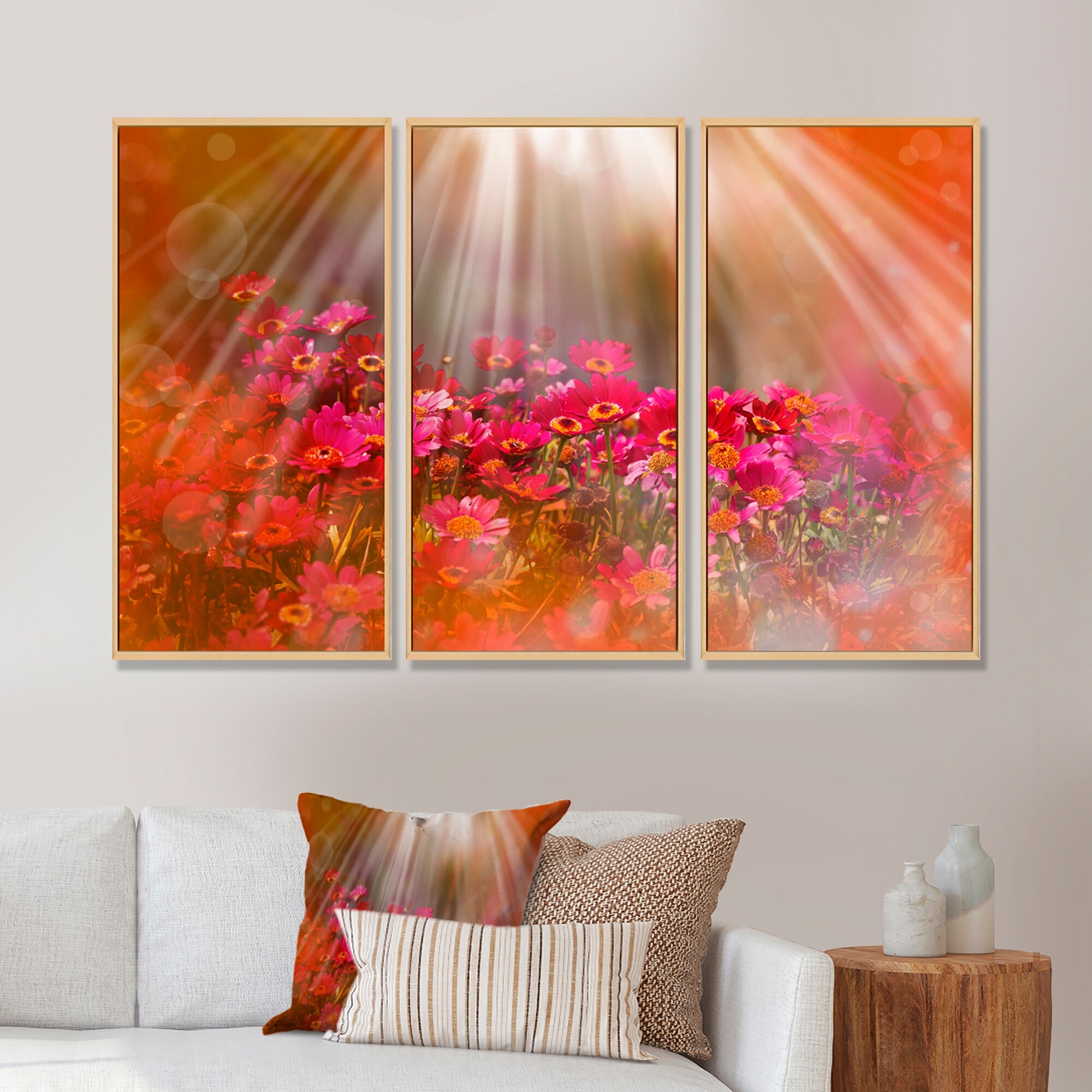Designart "Sunrays over Little Red Flowers" Floral Framed Artwork Set of 3 - 4 Colors of Frames
