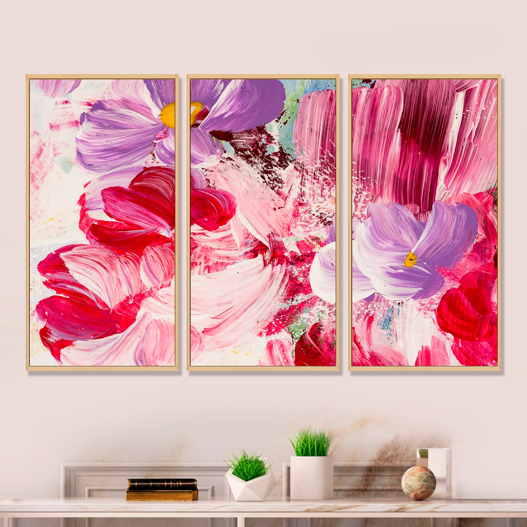 Designart "Red And Purple Abstract Flowers" Modern Framed Art Prints Set of 3 - 4 Colors of Frames