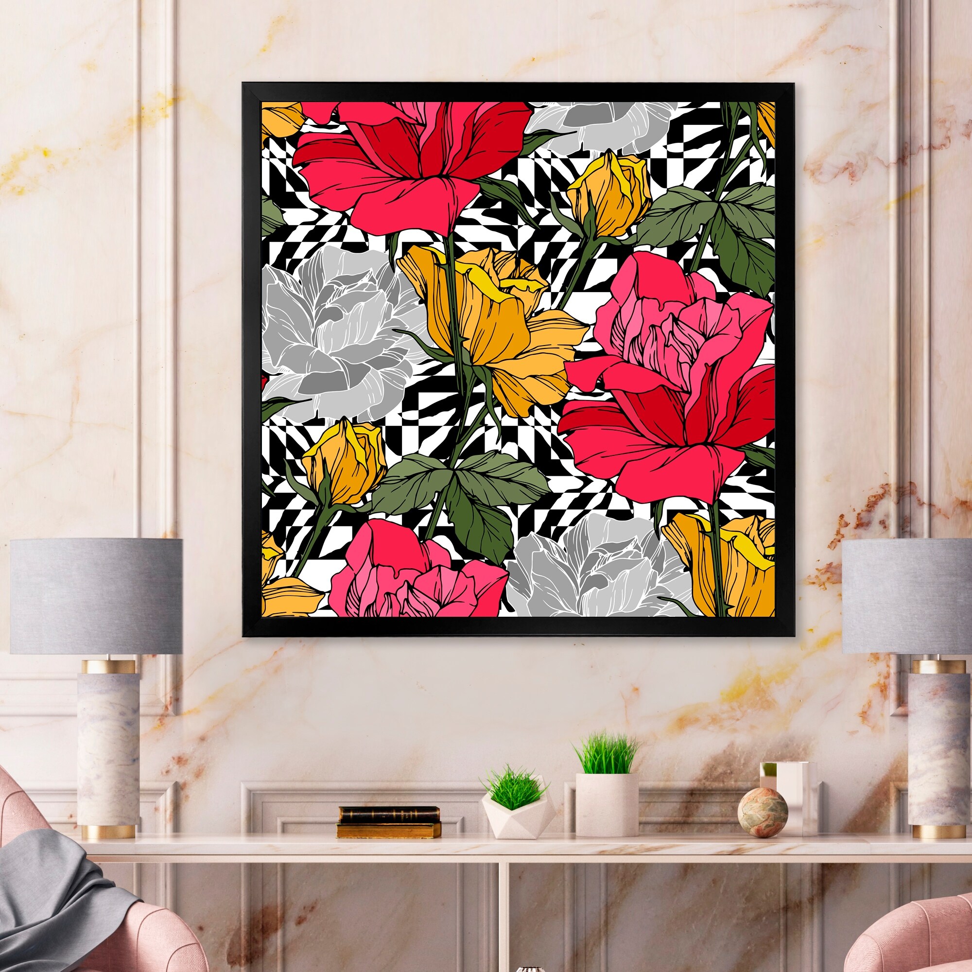 Designart "Red And Yellow Tropical Flowers on Black And White" Patterned Framed Art Print