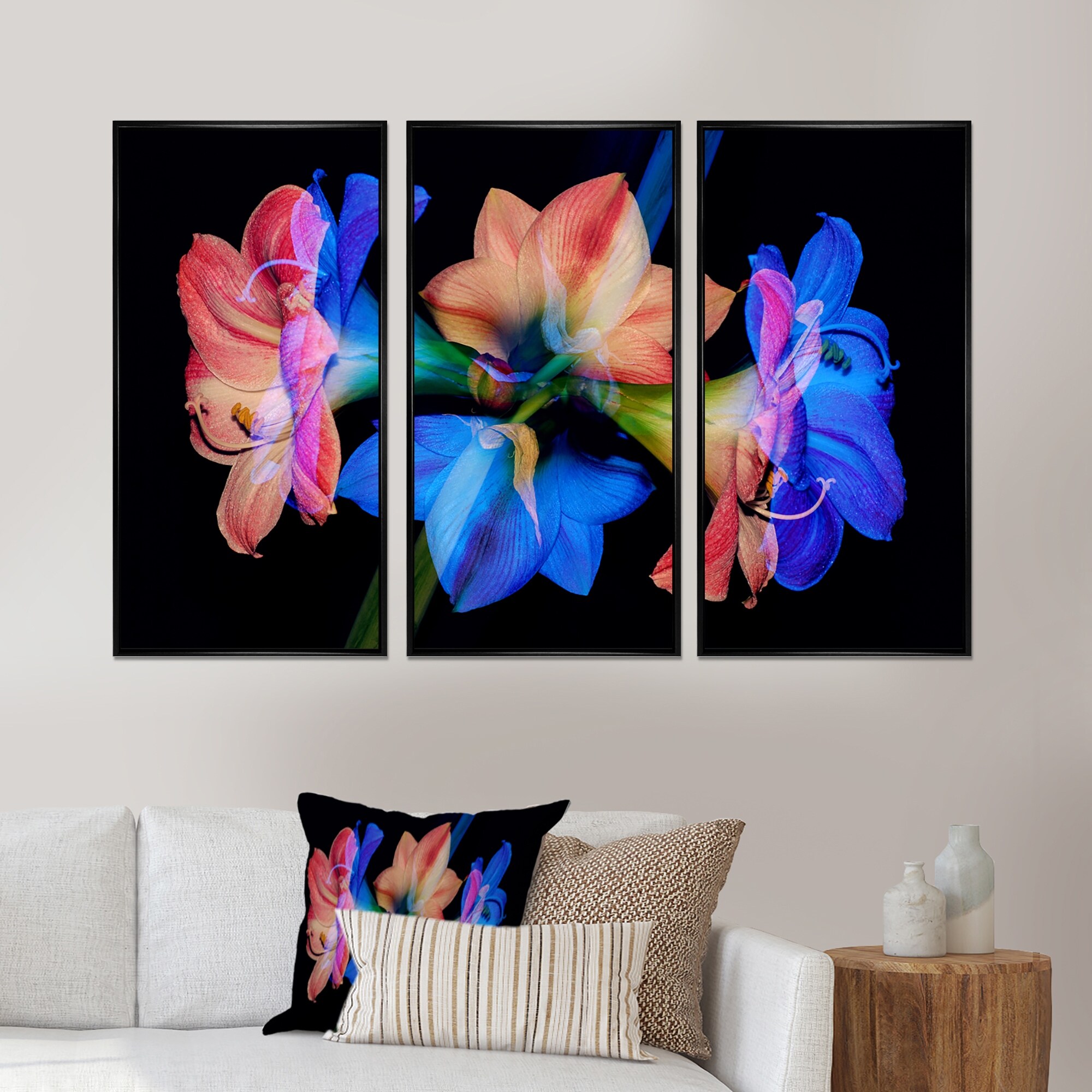 Designart "Abstract Blue Red Flower on Black" Floral Framed Art Set of 3 - 4 Colors of Frames