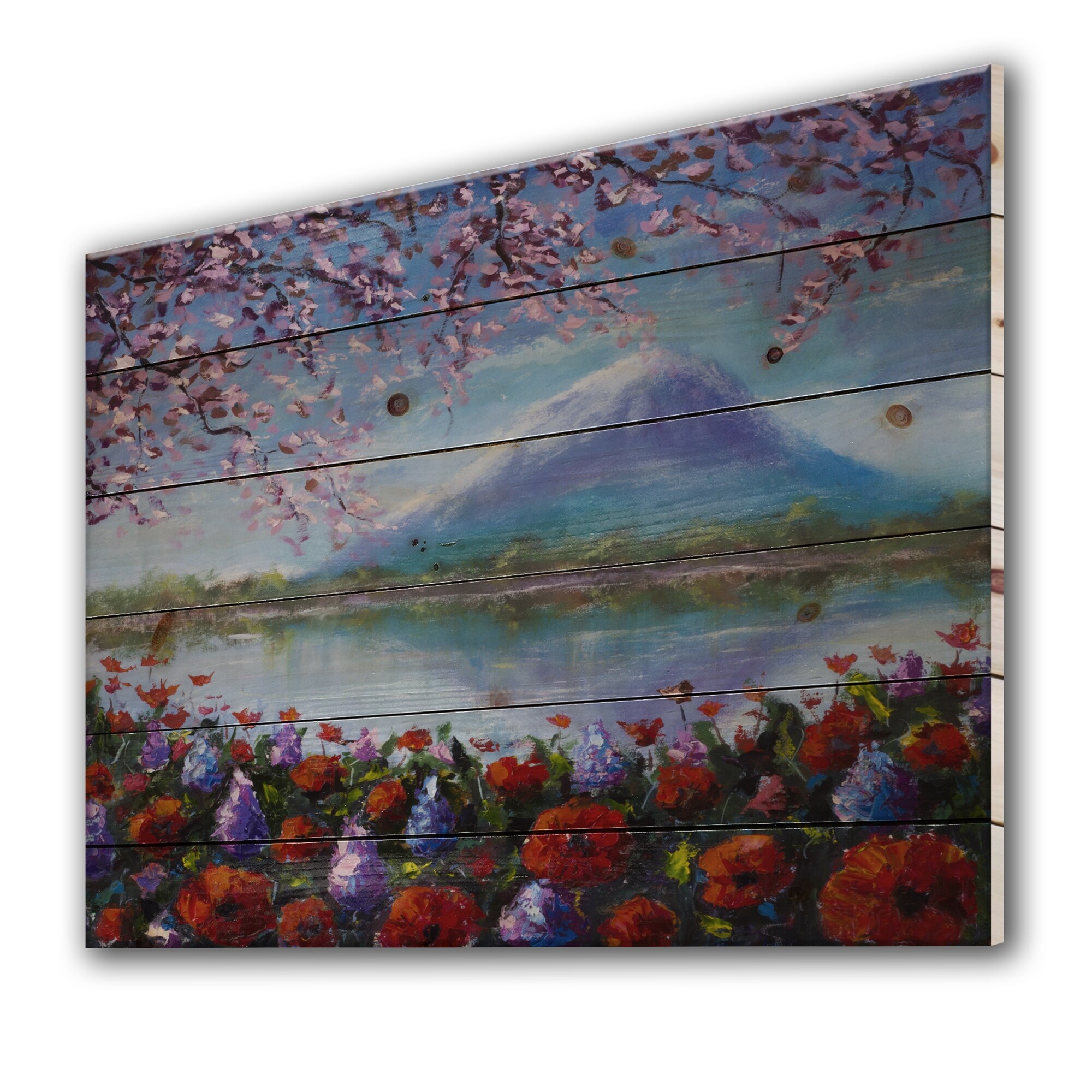Designart 'Sakura And Red Flowers By Lake With Mountain' Traditional Print on Natural Pine Wood