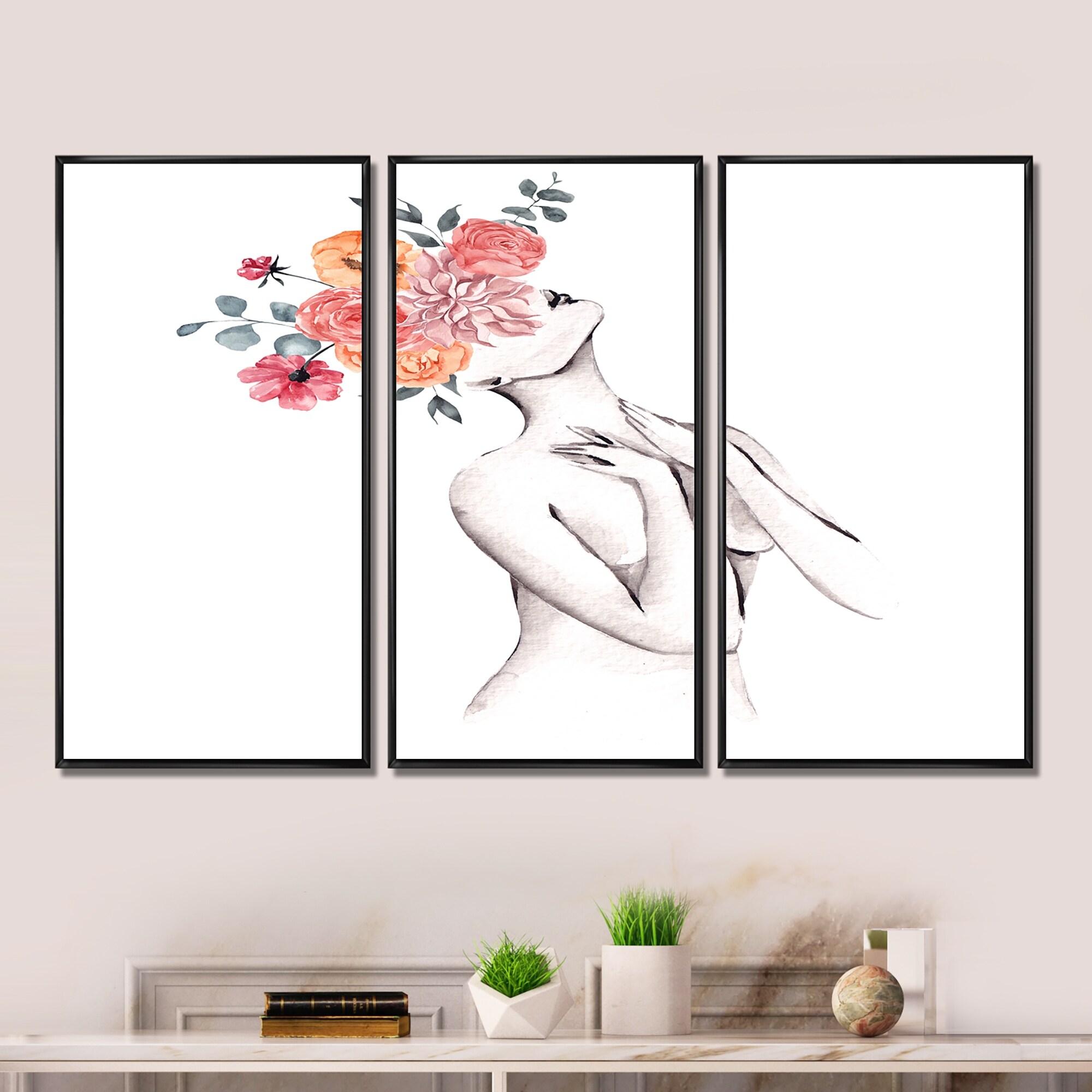 Designart "Woman Silhouette With Red And Purple Flowers XIII" Glam Framed Wall Art Set of 3 - 4 Colors of Frames